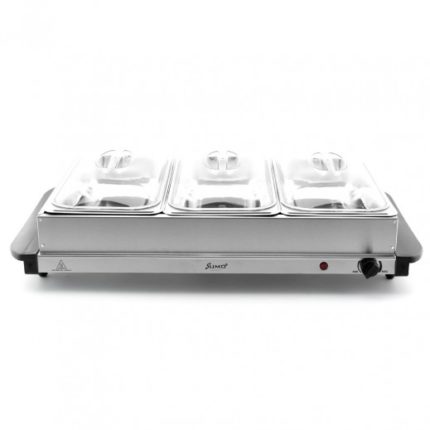 SUMO 3-tray electric buffet warmer with adjustable temperature, stainless-steel trays, and transparent lids — keeps food perfectly hot for hours during family meals or gatherings.