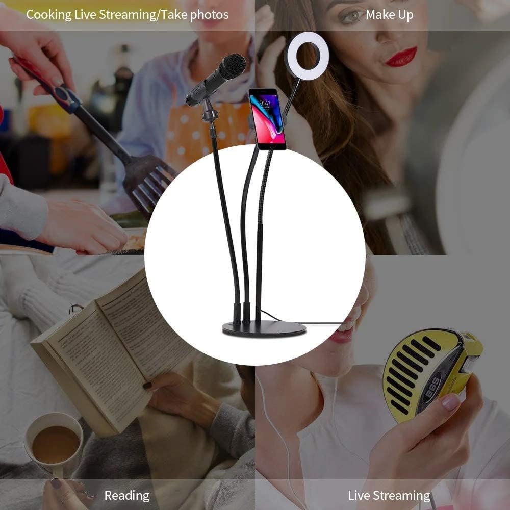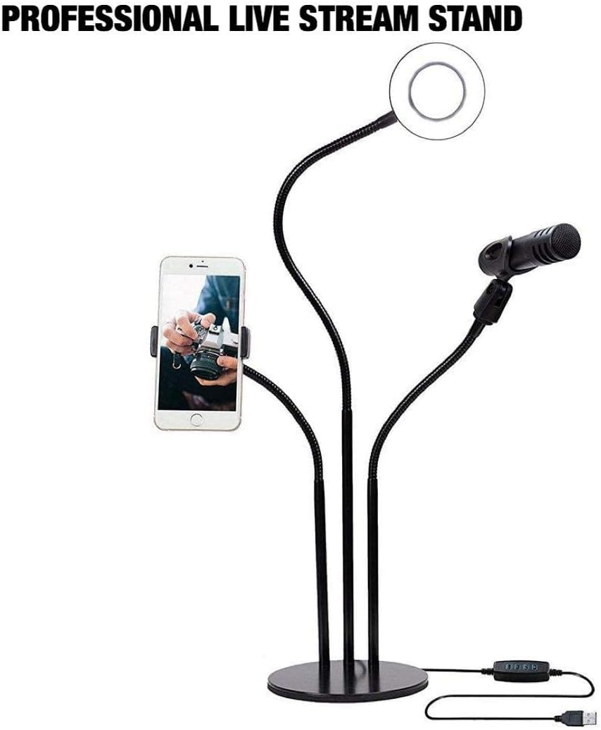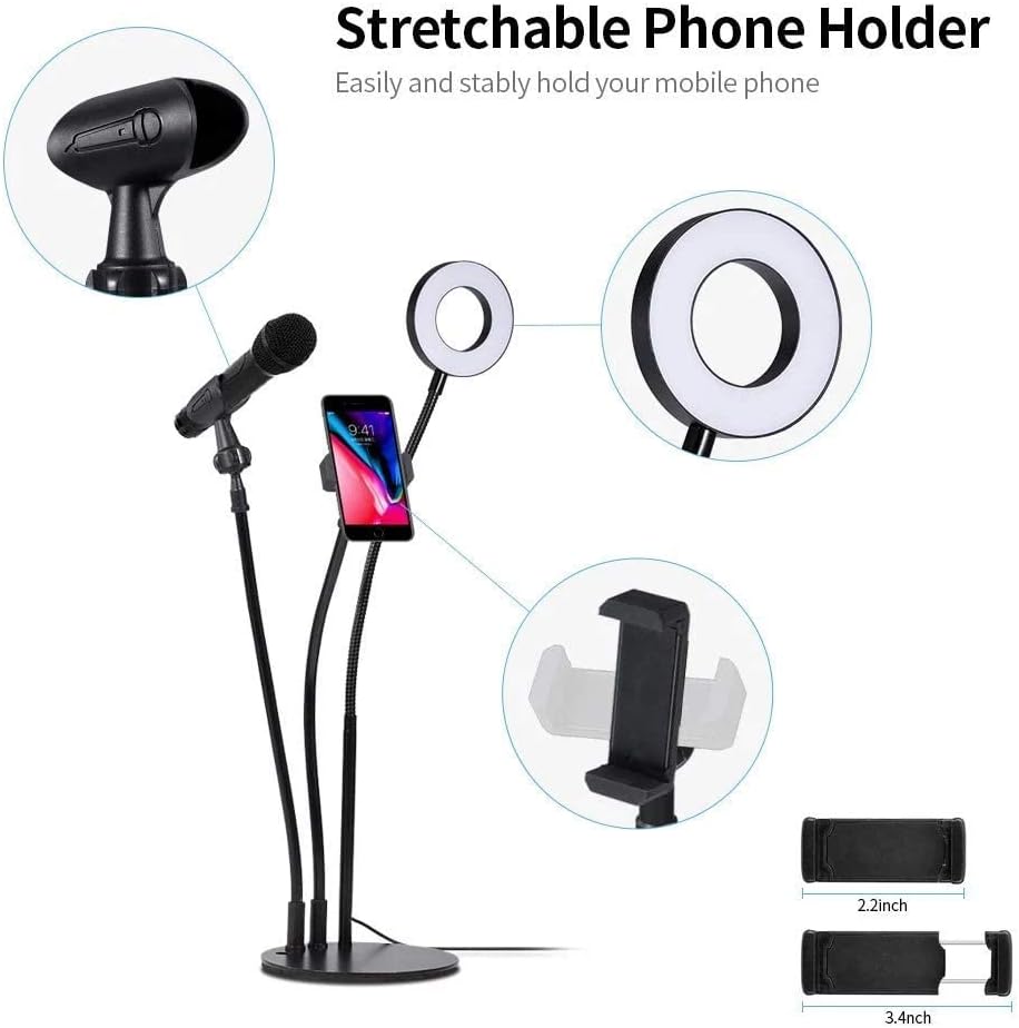 يجمع التصميم 3 في 1 بين حامل الهاتف المحمول وحامل الميكروفون والمصباح، باستخدام خرطوم معدني قابل للتعديل عالميًا يمكنك ثنيه حسب الرغبة، واختيار الزاوية التي تناسبك.