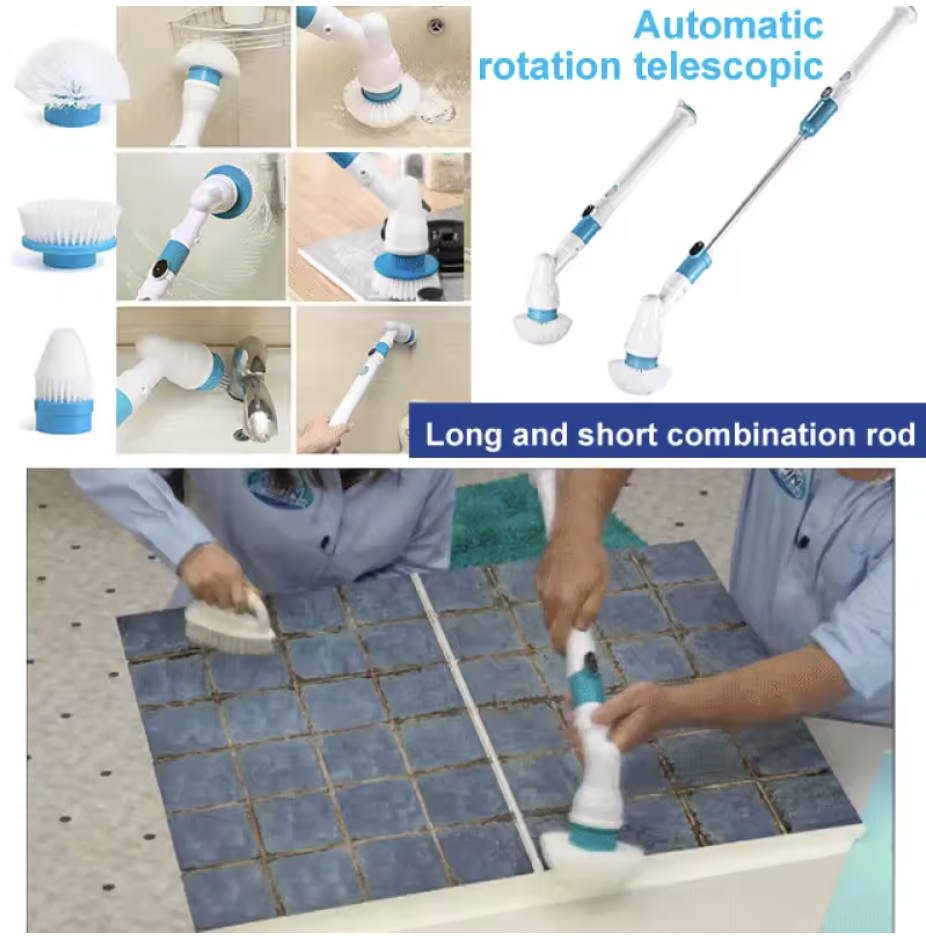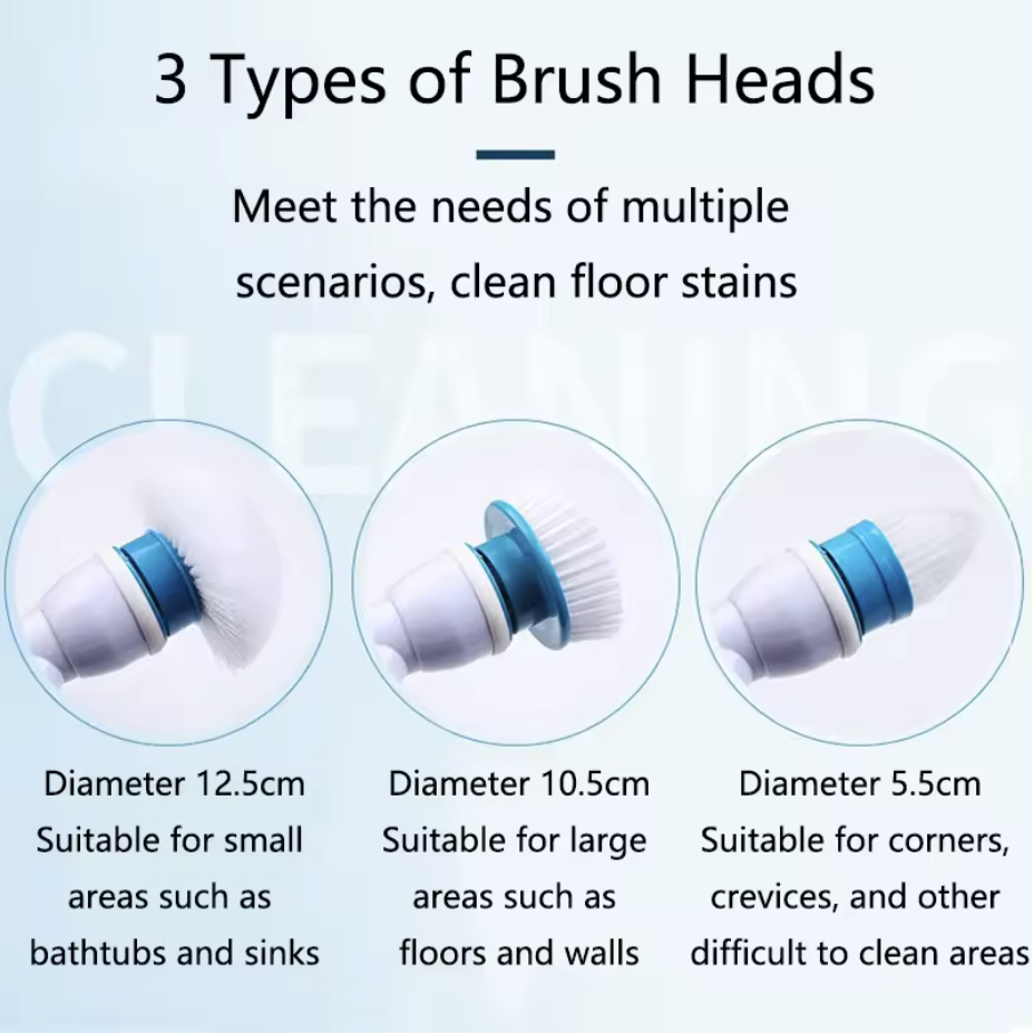 تم تصميم فرشاة حوض الاستحمام الكهربائية هذه بثلاثة رؤوس فرشاة، يمكنها تلبية احتياجاتك المختلفة. فرشاة مسطحة واسعة للغاية للبلاط والباب والنوافذ والزجاج وحمام السباحة؛ فرشاة مسطحة صغيرة للاستحمام والمطبخ والموقد والشواية؛ فرشاة مستديرة للسطح المنحني، مثل حوض الاستحمام أو الحوض أو القاعدة أو المرحاض؛ فرشاة زاوية لحشو البلاط والحواف والزوايا والشقوق والأماكن الضيقة.