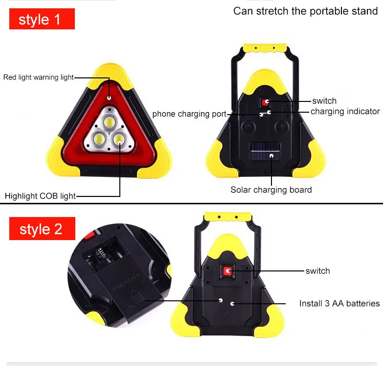 مصباح تحذير طوارئ LED محمول، مصباح تحذير حركة المرور، مصباح مثلث يعمل بالطاقة الشمسية، مصباح COB قابل لإعادة الشحن عبر USB، ضوء سيارة
