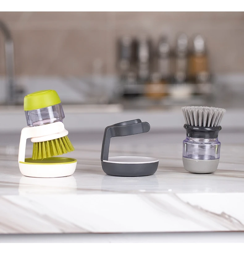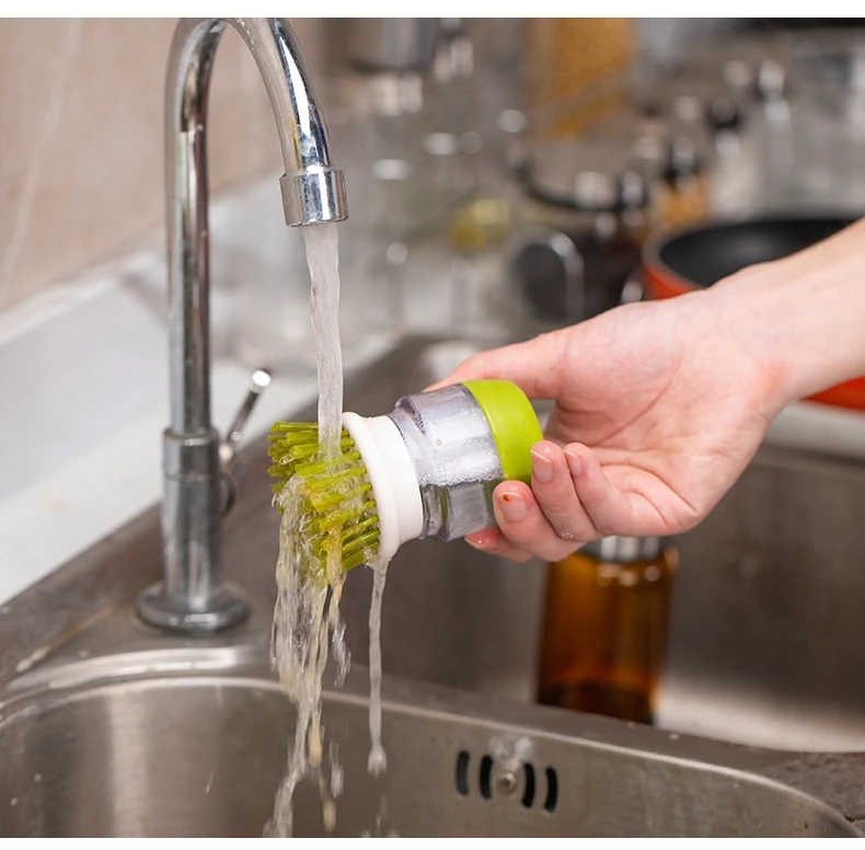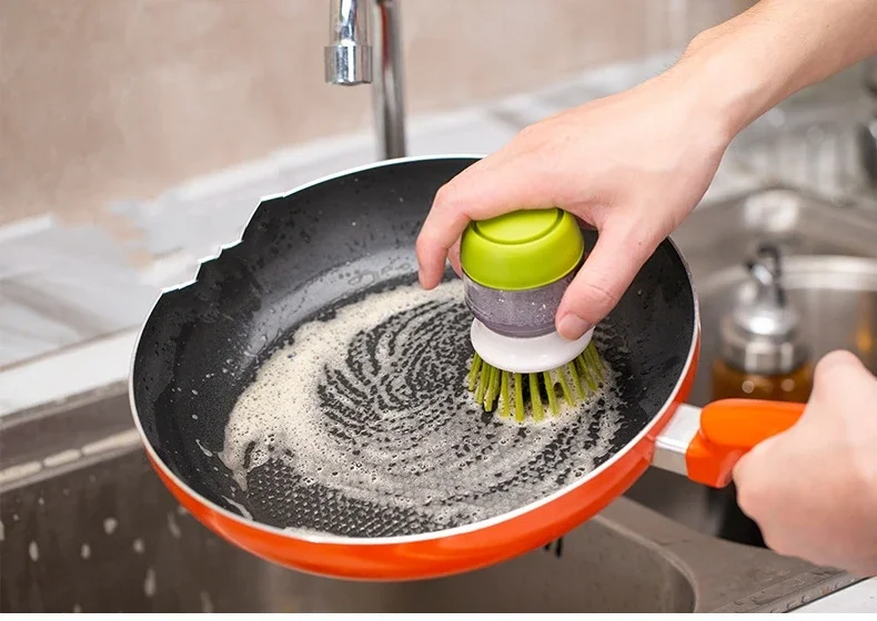 يضم زر محمل بنابض, ، تطلق فرشاة تنظيف الأطباق Palm Brush Scrubber صابون الأطباق مباشرةً في الشعيرات، مما يلغي الحاجة إلى الإسفنج أو زجاجات الصابون. خزان بلاستيكي شفاف يخزن ما يكفي من المنظفات لاستخدامات متعددة، بينما شعيرات نايلون متينة لطيفة على أواني الطهي غير اللاصقة، لكنها قوية على الأوساخ. إنها الأداة المثالية لغسل الأواني والمقالي والأطباق، وحتى مواقد الطهي.