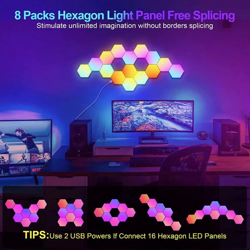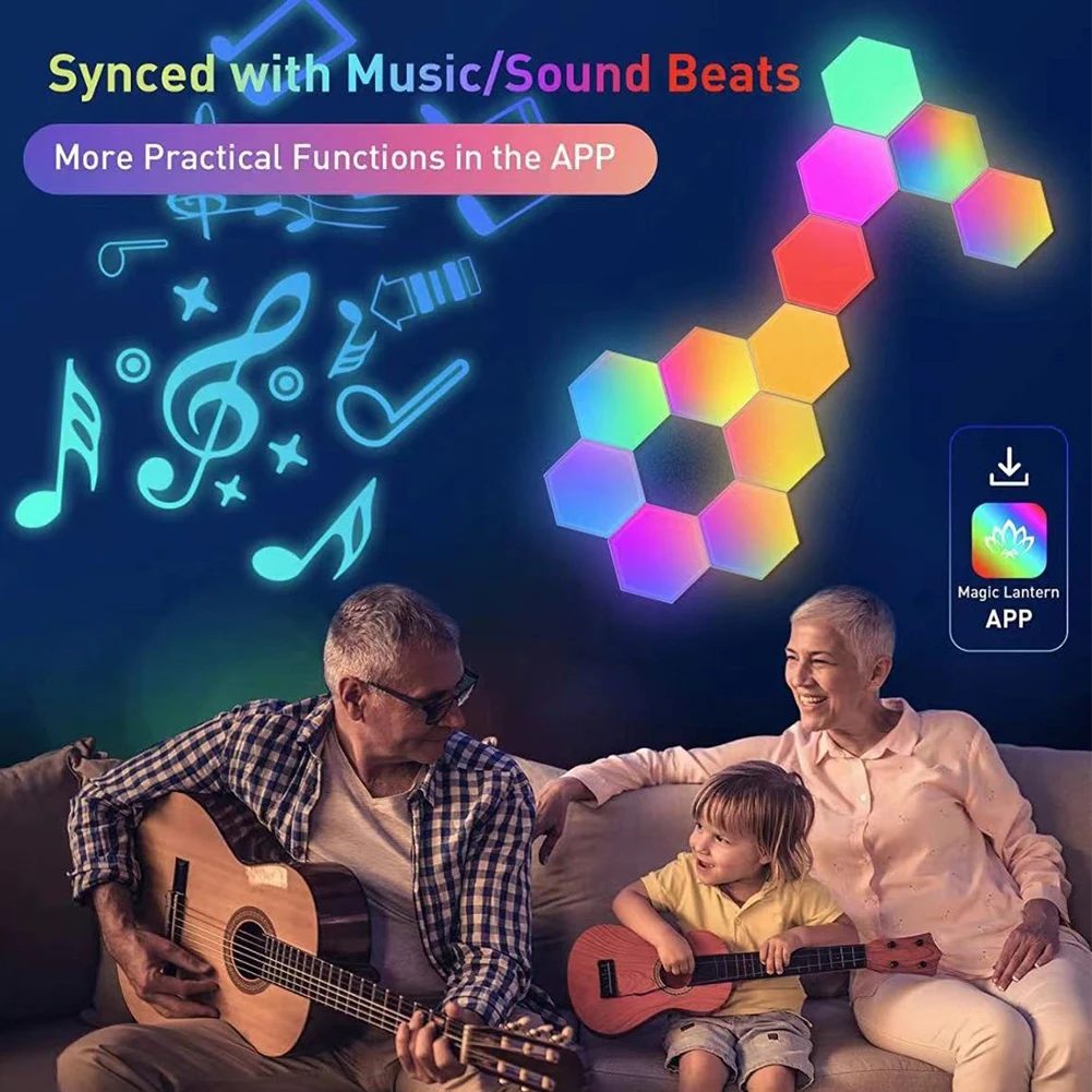 مصباح لمس سداسي RGB بتصميم معياري، 16 مليون لون، مزامنة الموسيقى، التحكم بالتطبيق والصوت، مثالي لغرف النوم وإعدادات الألعاب.