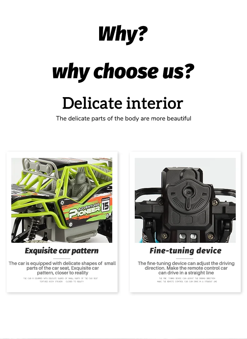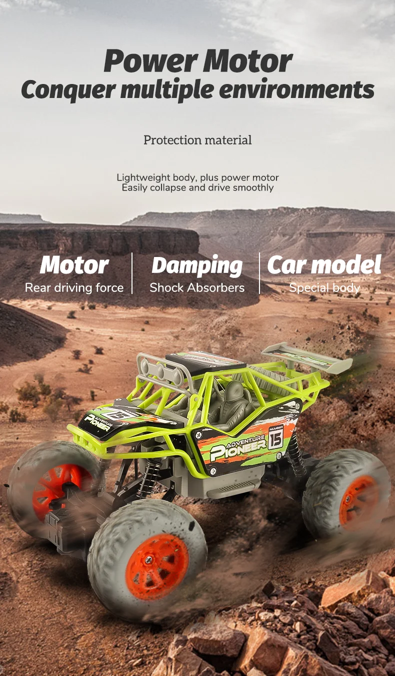 مجهزة بـ نظام التحكم عن بعد 2.4G, ، فهو يوفر تشغيلًا سلسًا، مما يسمح لك بالتسابق مع الأصدقاء دون أي تدخل. محرك قوي للدفع الرباعي جنبا إلى جنب مع ممتصات الصدمات المستقلة يضمن الاستقرار، مما يجعل من السهل التغلب على المنحدرات الشديدة والطرق الوعرة والتحديات على الطرق الوعرة.