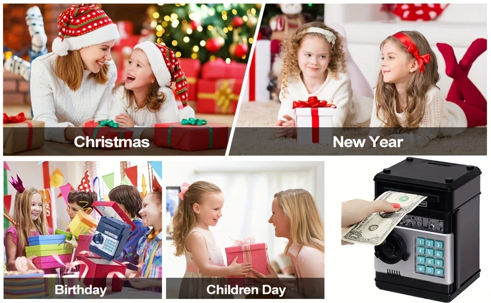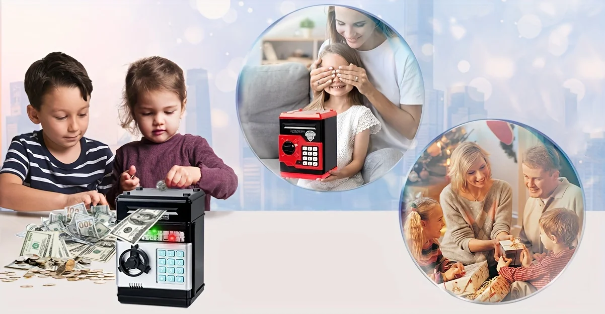 خزنة إلكترونية آمنة مع قفل بكلمة مرور - صندوق نقود ممتع على طراز ماكينة الصراف الآلي للأطفال لحفظ العملات المعدنية والفواتير، ويجمع بين التعليم والترفيه.