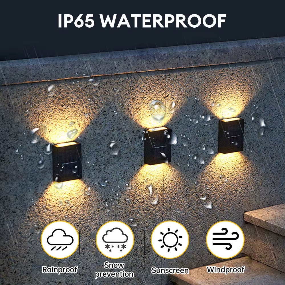 مصباح حائط LED يعمل بالطاقة الشمسية، تصميم مضيء لأعلى ولأسفل، 2 أو 6 مصابيح LED، مقاوم للماء IP65، شحن تلقائي 6-8 ساعات، خياران للتثبيت، للحديقة والفناء والسياج والشرفة.