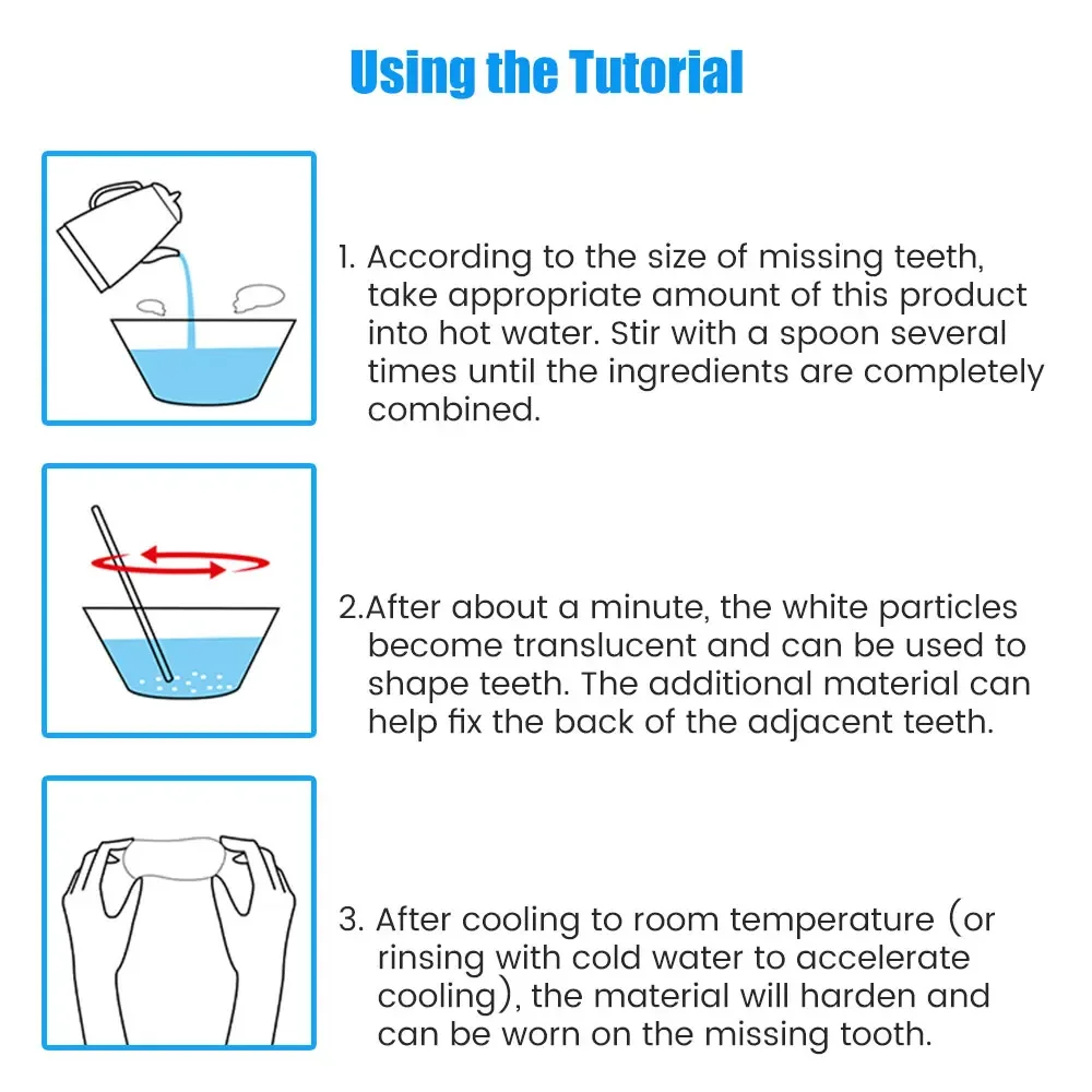 3. يمكن تطبيقه مع الماء الساخن لإعادة تشكيله على شكل السن لملء الفجوات المتروكة في الأسنان المكسورة أو المفقودة، مما قد يجعلك تبتسم بجمال وثقة.