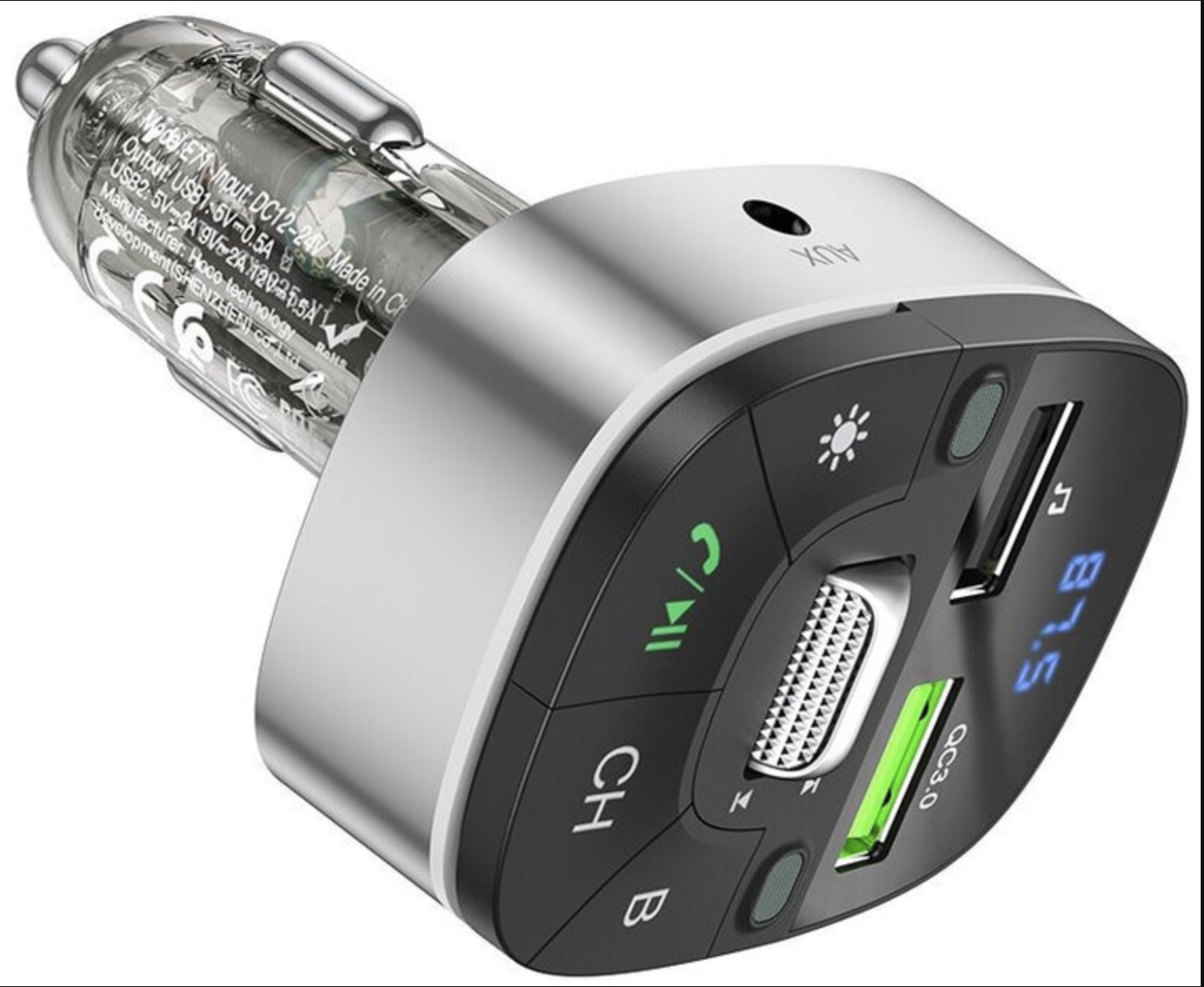 شاحن سيارة HOCO شفاف QC3.0 بقوة 18 واط، مزود بمدخل AUX وبلوتوث وجهاز إرسال FM وUSB وشاشة LED بدون استخدام اليدين وإضاءة محيطية وولاعة سجائر