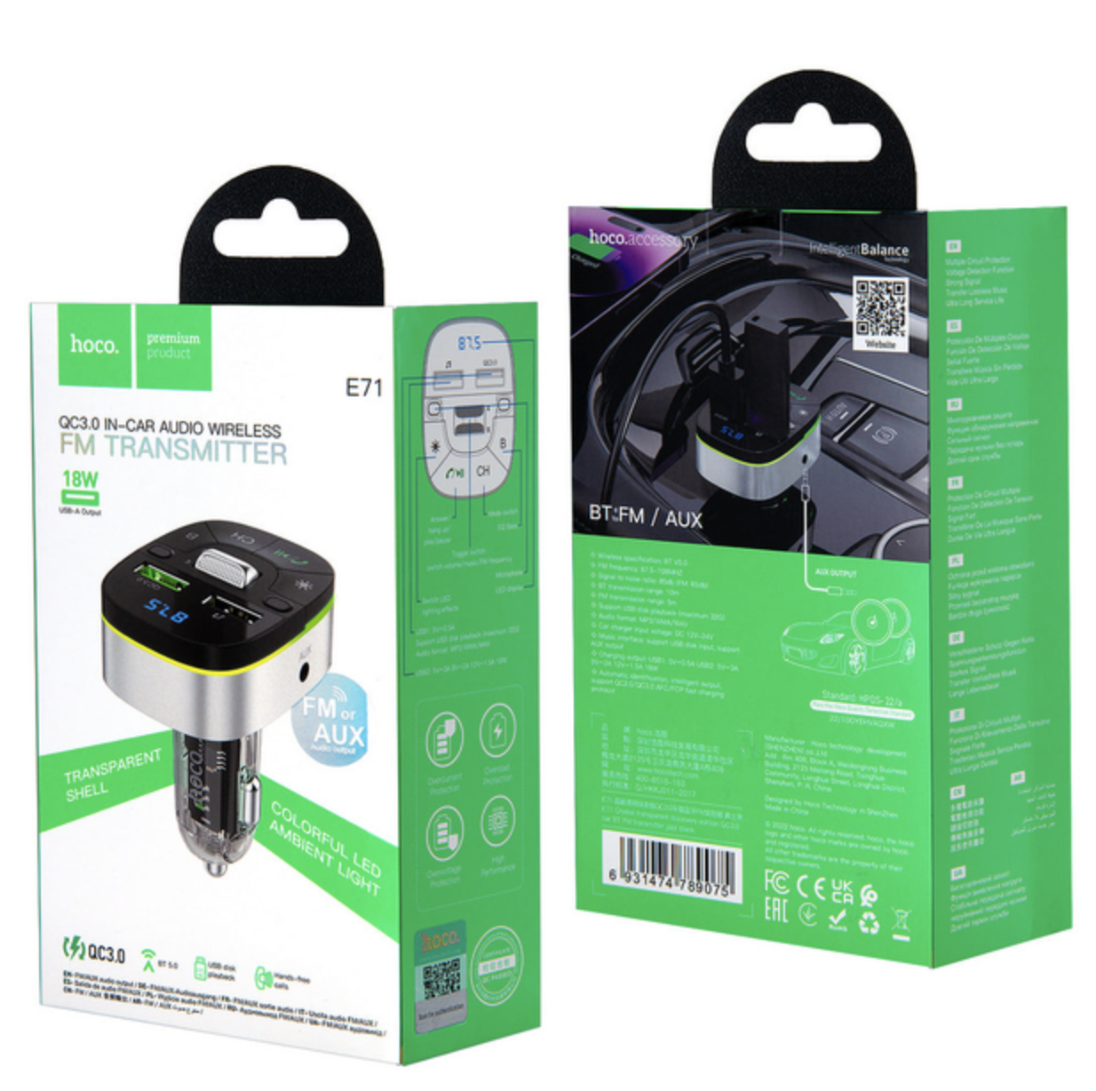 جهاز إرسال FM للسيارة بتقنية بلوتوث QC3.0 من HOCO E71، شفاف، الميزات: 1. المقاس: 76 × 52 × 40 مم؛ الوزن: 40 جرامًا
