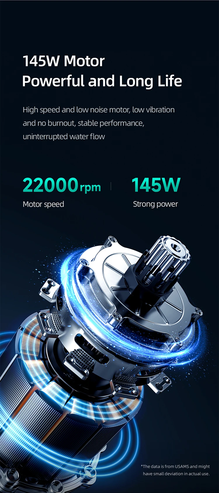 مجهزة بـ بطارية قابلة لإعادة الشحن بسعة 5000 مللي أمبير في الساعة, ، فإنه يسلم ما يصل إلى 25 دقيقة من قوة التنظيف لكل شحنة. ال تصميم ذاتي التحضير يضمن إمكانية سحب المياه بسهولة من الدلاء أو الزجاجات أو الأنهار، مما يجعله حلاً محمولاً مثاليًا للرحلات البرية والاستخدام في الهواء الطلق.