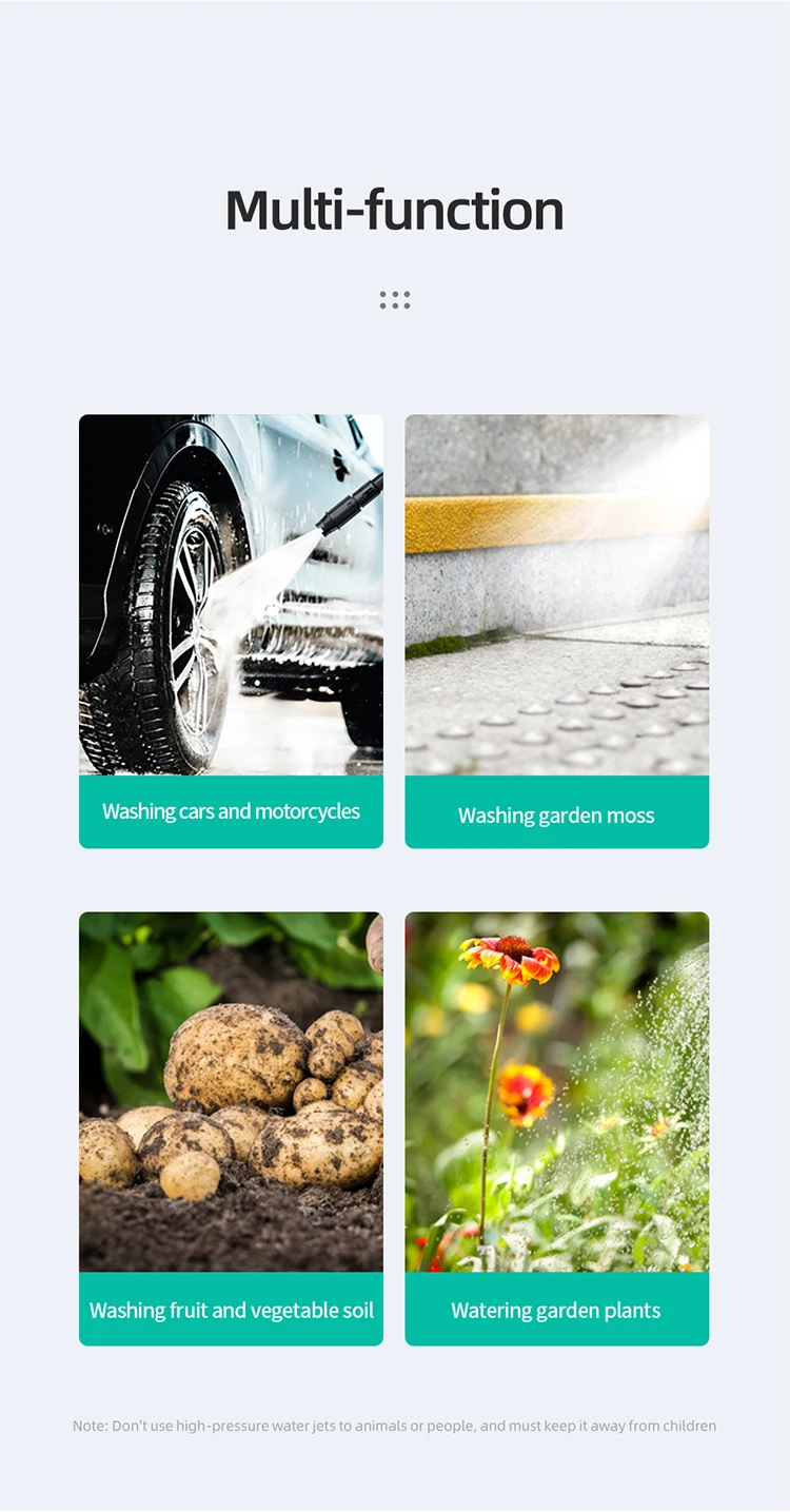 الغسالة تأتي مع فوهات قابلة للتعديل, ، أ أنبوب مياه بطول 5 أمتار, ، و ملحق وعاء الرغوة للتعامل مع كل شيء، من الشطف اللطيف إلى إزالة الأوساخ الثقيلة. صغير الحجم، خفيف الوزن، ومتين مواد ABS + السيليكون, تم تصميمه لتوفير الراحة والأداء طويل الأمد.