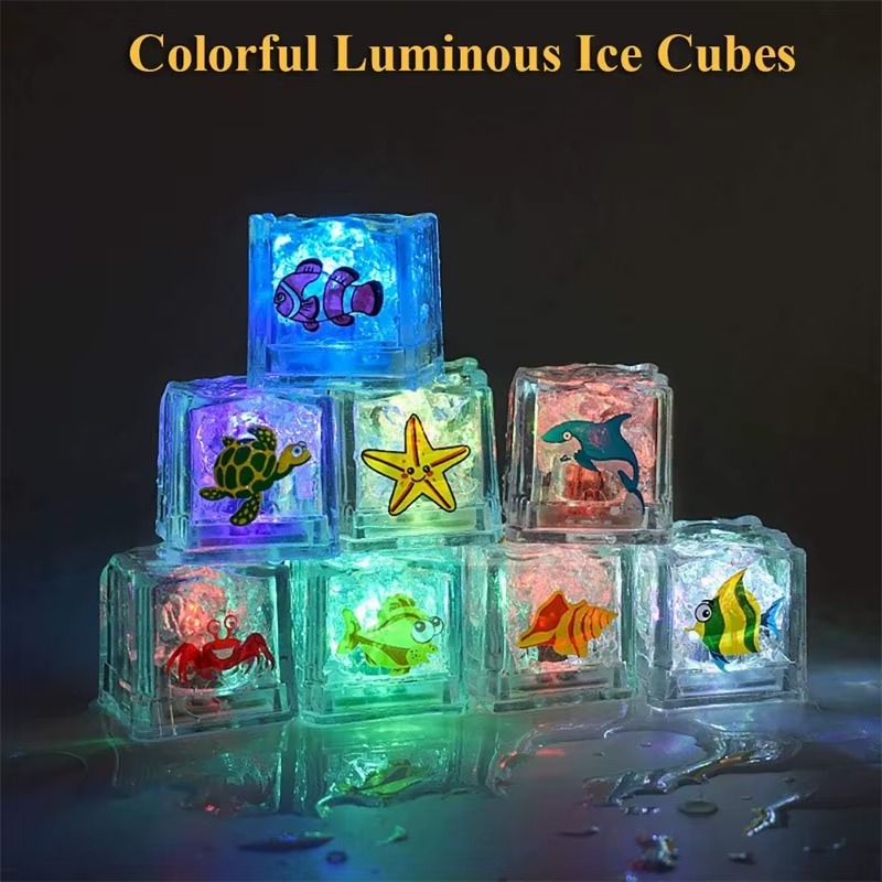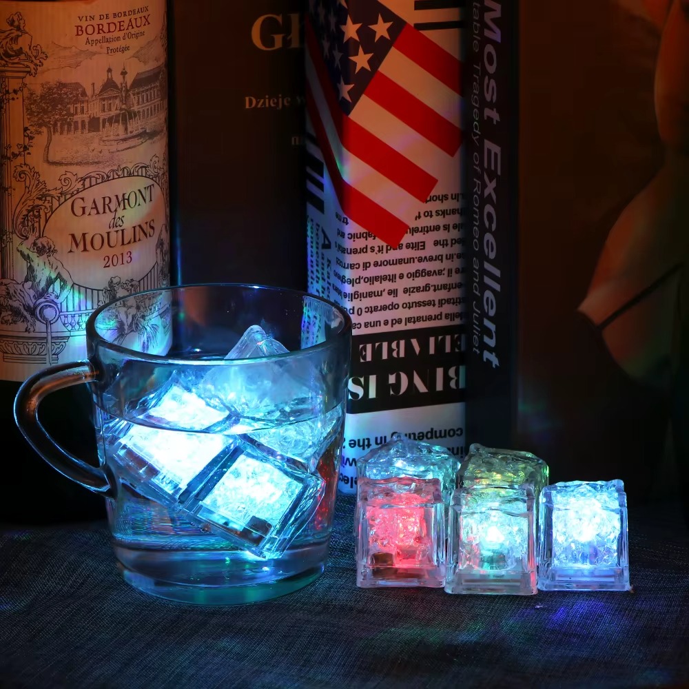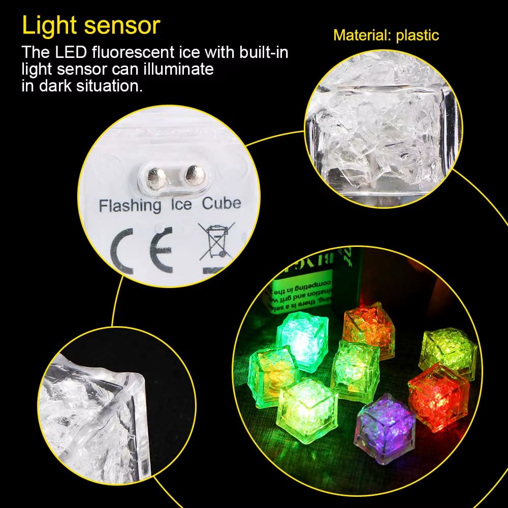Multicolor LED ice cubes made of food grade acrylic plastic with non toxic gel waterproof design flashing light auto on when in liquid and off when removed powered by built in 3V batteries safe reusable compact and easy to use ideal for weddings birthdays bars pool parties and festive decorations not edible keep away from small children