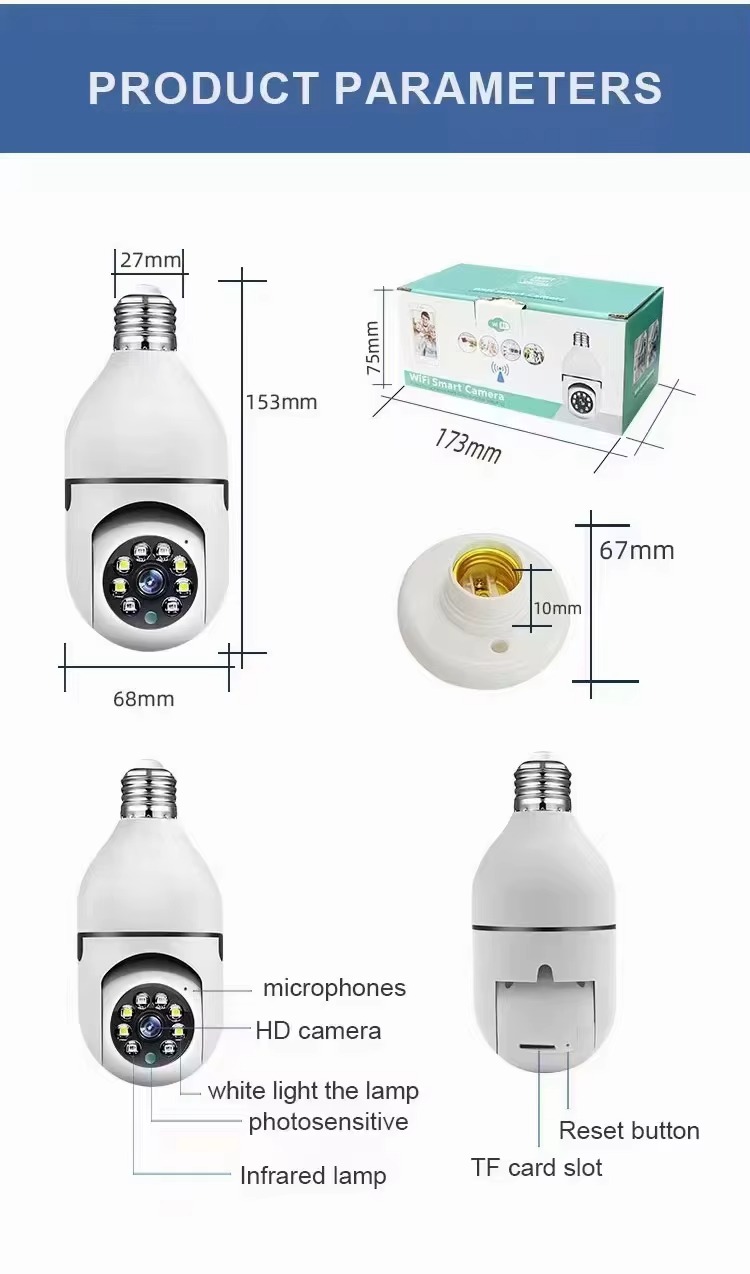 The Bulb Surveillance Camera is a smart 3MP WiFi PTZ dome that fits directly into any E27 lamp socket, making installation quick and hassle-free. It delivers 1296P Full HD video, 360° panoramic view, and auto-tracking to cover every corner without blind spots. With two-way audio, motion detection, and real-time alerts via the CareCam APP, you’ll always stay connected and protected.