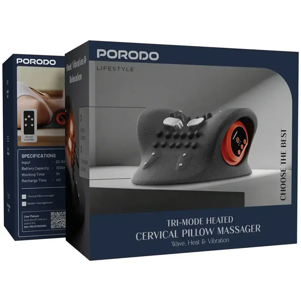 Porodo Lifestyle tri-mode cervical pillow massager (PDLFSTBZ02BK) with wave heat, vibration levels, magnetic comfort points, and rechargeable USB-C battery for neck and shoulder relief.