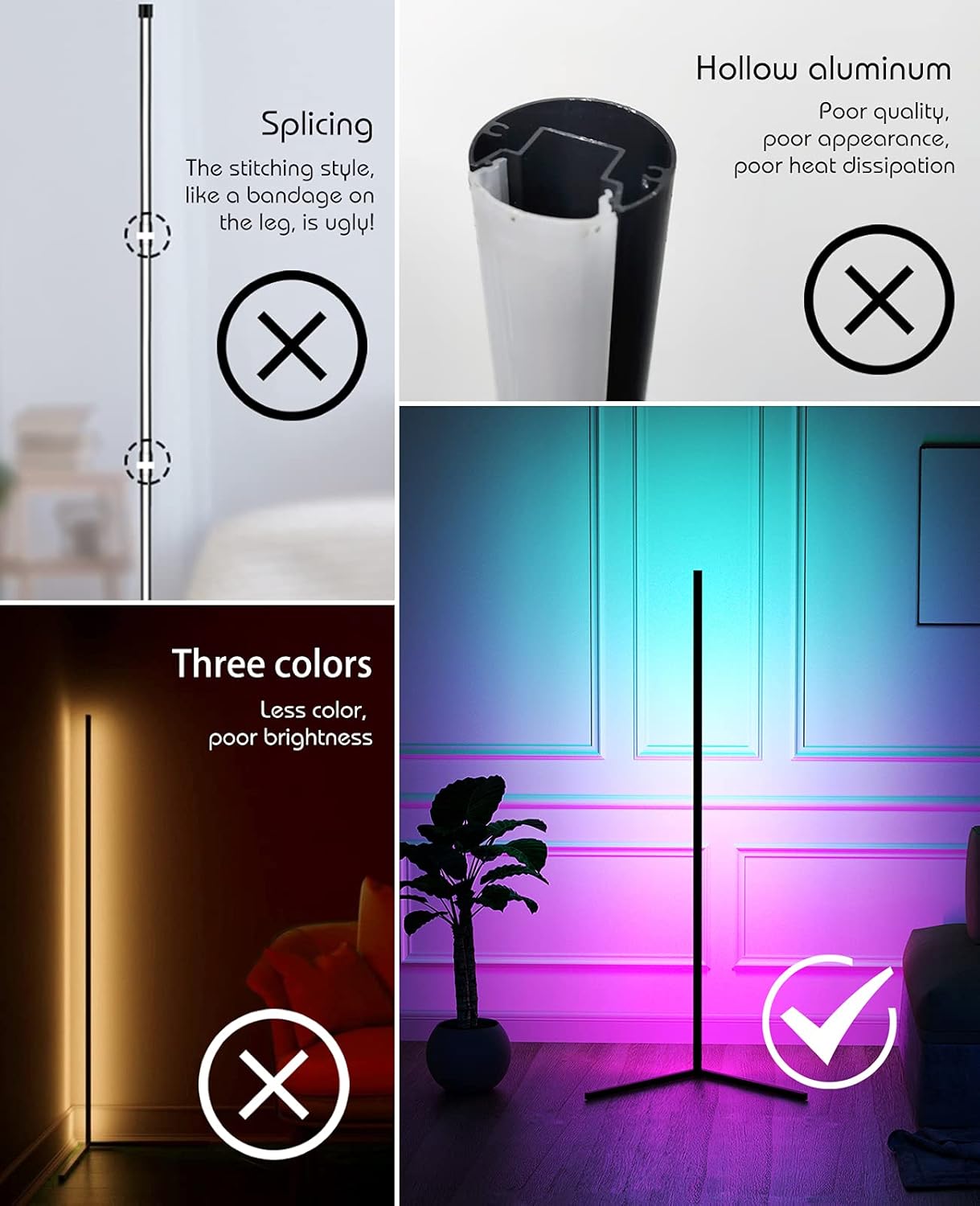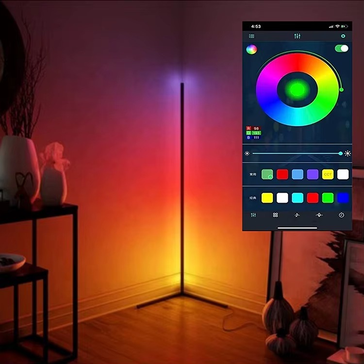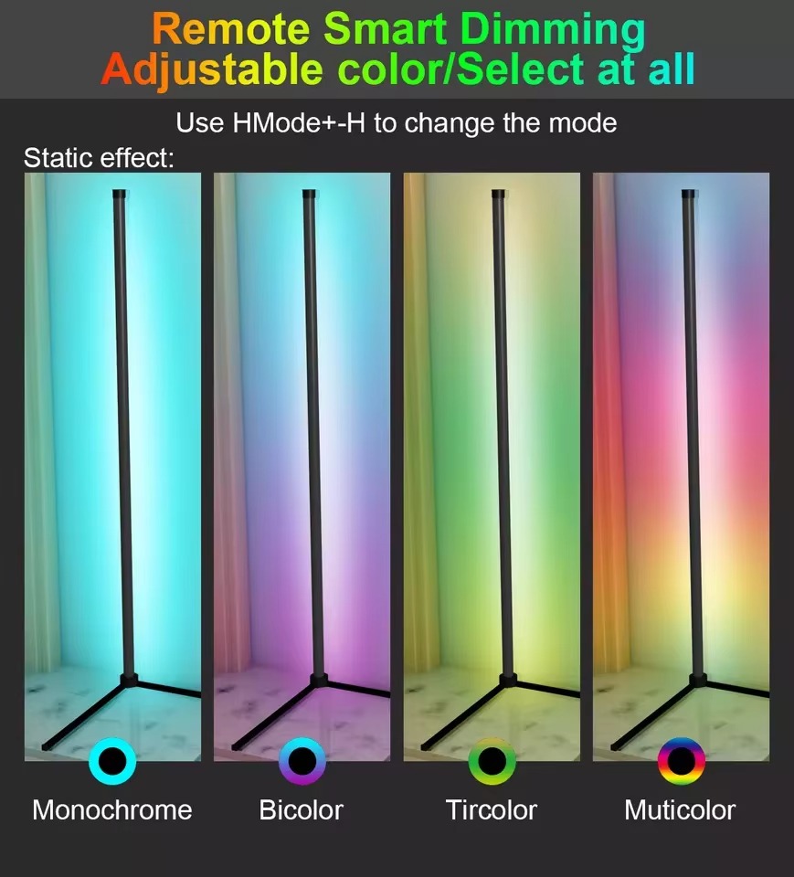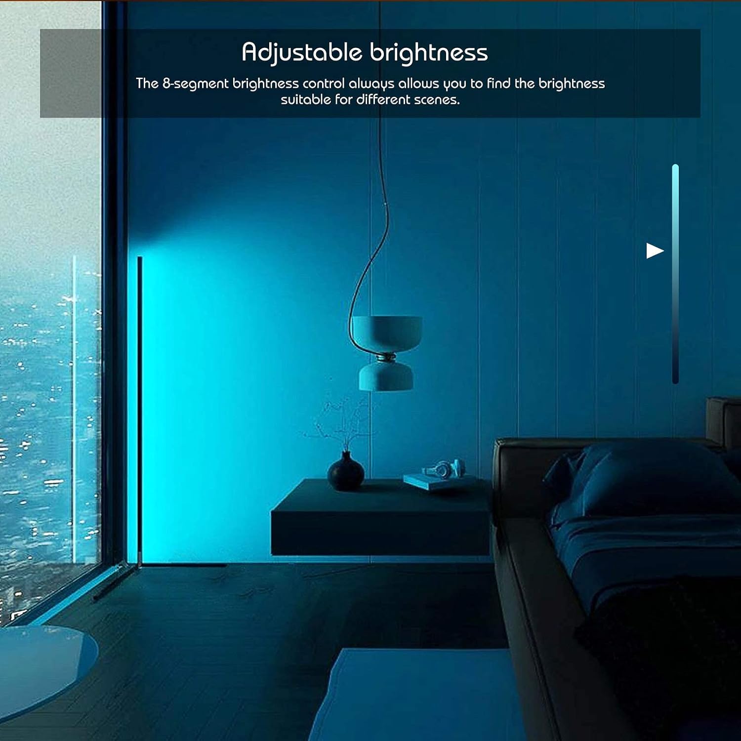 The Corner Lamp is a smart RGB LED floor lamp that transforms your space with 16 million colors, adjustable brightness, and dynamic lighting effects. Equipped with 96 premium LED beads, it delivers vivid, immersive light for gaming, parties, or relaxing evenings. With Bluetooth APP and remote control, you can easily adjust colors, brightness, speed, and modes. A built-in microphone syncs the lights with music or ambient sounds, creating the perfect atmosphere for any occasion. Made of durable aluminum alloy with a stable triangular iron base, this 60-inch height-adjustable lamp is easy to install, stylish, and long-lasting.