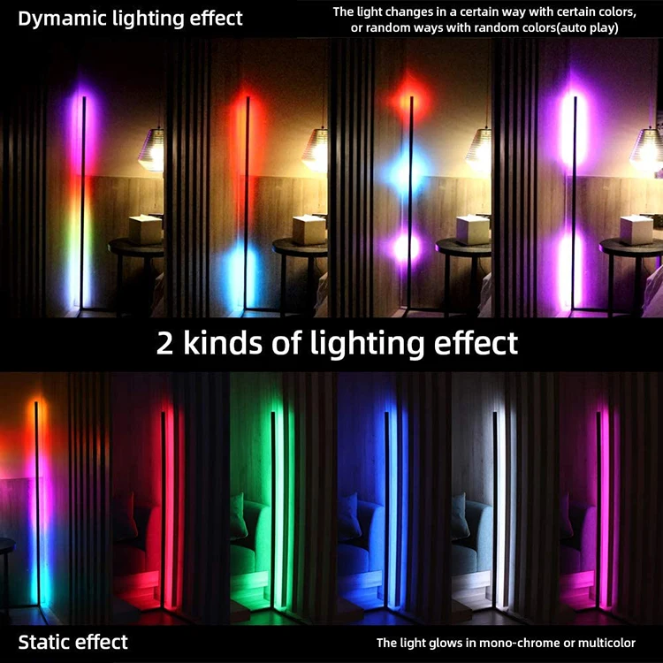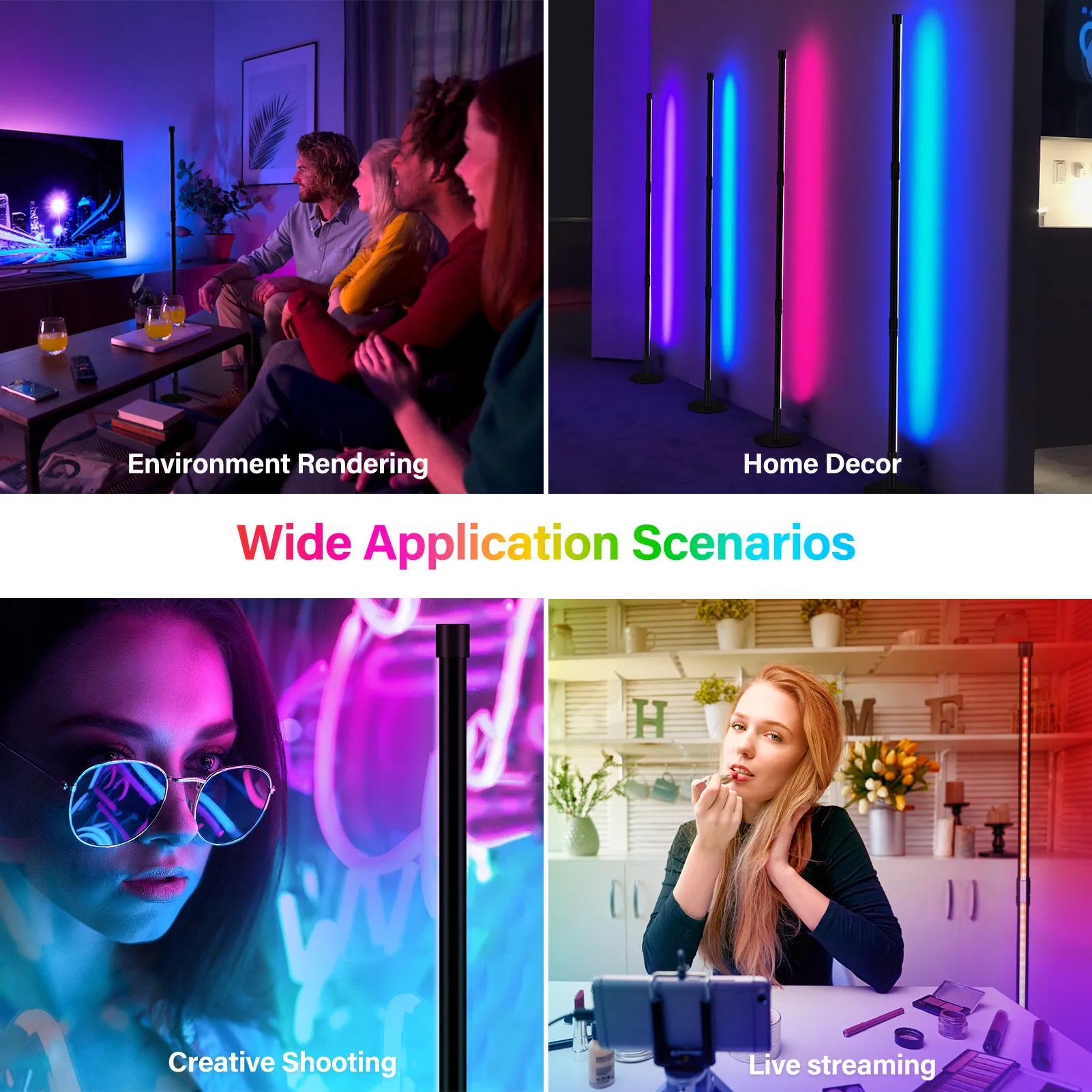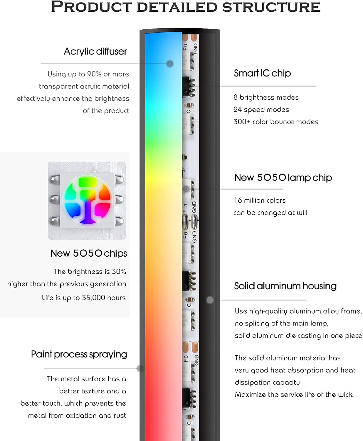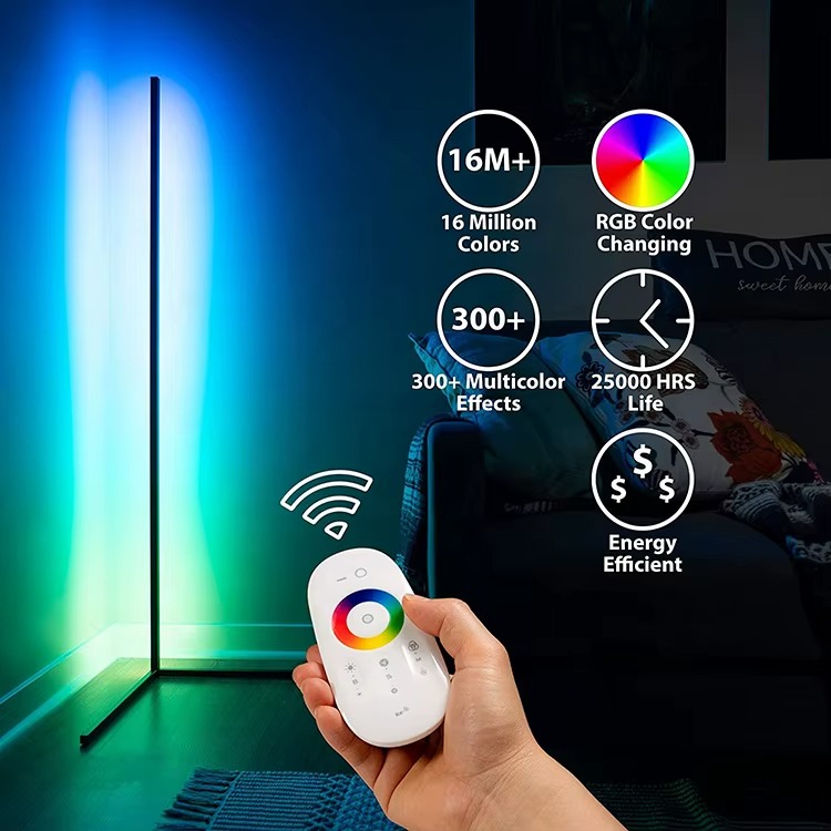 The Corner Lamp is a smart RGB LED floor lamp that transforms your space with 16 million colors, adjustable brightness, and dynamic lighting effects. Equipped with 96 premium LED beads, it delivers vivid, immersive light for gaming, parties, or relaxing evenings. With Bluetooth APP and remote control, you can easily adjust colors, brightness, speed, and modes. A built-in microphone syncs the lights with music or ambient sounds, creating the perfect atmosphere for any occasion. Made of durable aluminum alloy with a stable triangular iron base, this 60-inch height-adjustable lamp is easy to install, stylish, and long-lasting.