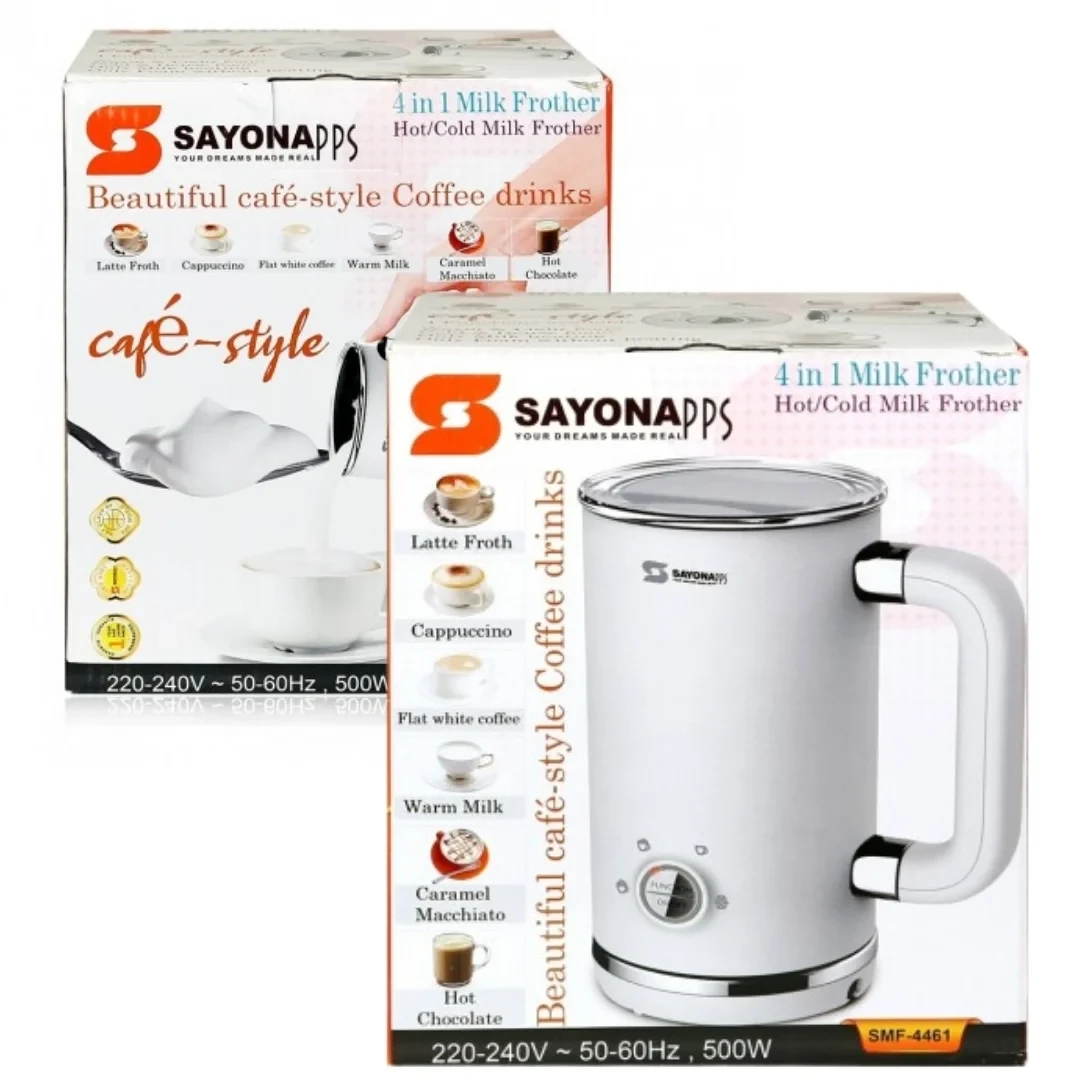 SAYONA electric milk frother (SMF-4461) 4-in-1 with 500W power, hot & cold foam modes, non-stick interior, and auto shut-off safety system.