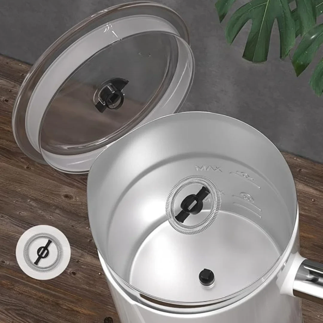 🌀✨ Equipped with a removable magnetic whisk, the frother spins rapidly inside the non-stick coated boiler to create smooth, uniform foam. The non-stick interior prevents milk residue buildup, making cleaning quick and effortless, while the transparent lid allows easy monitoring during operation.