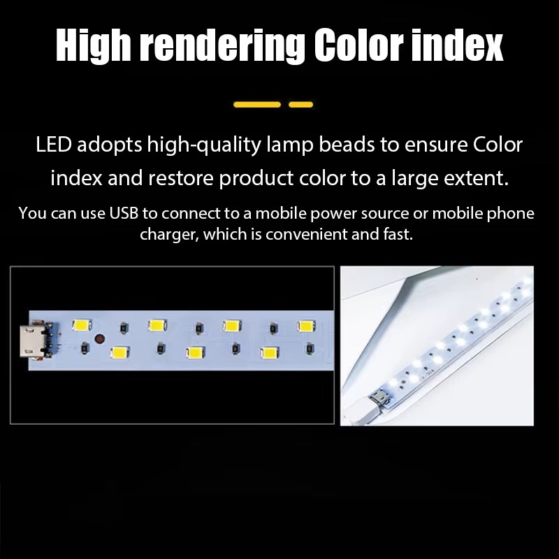 • With 2 backgrounds pads(black and white), highly energy-efficient LED light Strip with micro USB port, powered by your power Bank or USB power supply (Power bank Not included)
