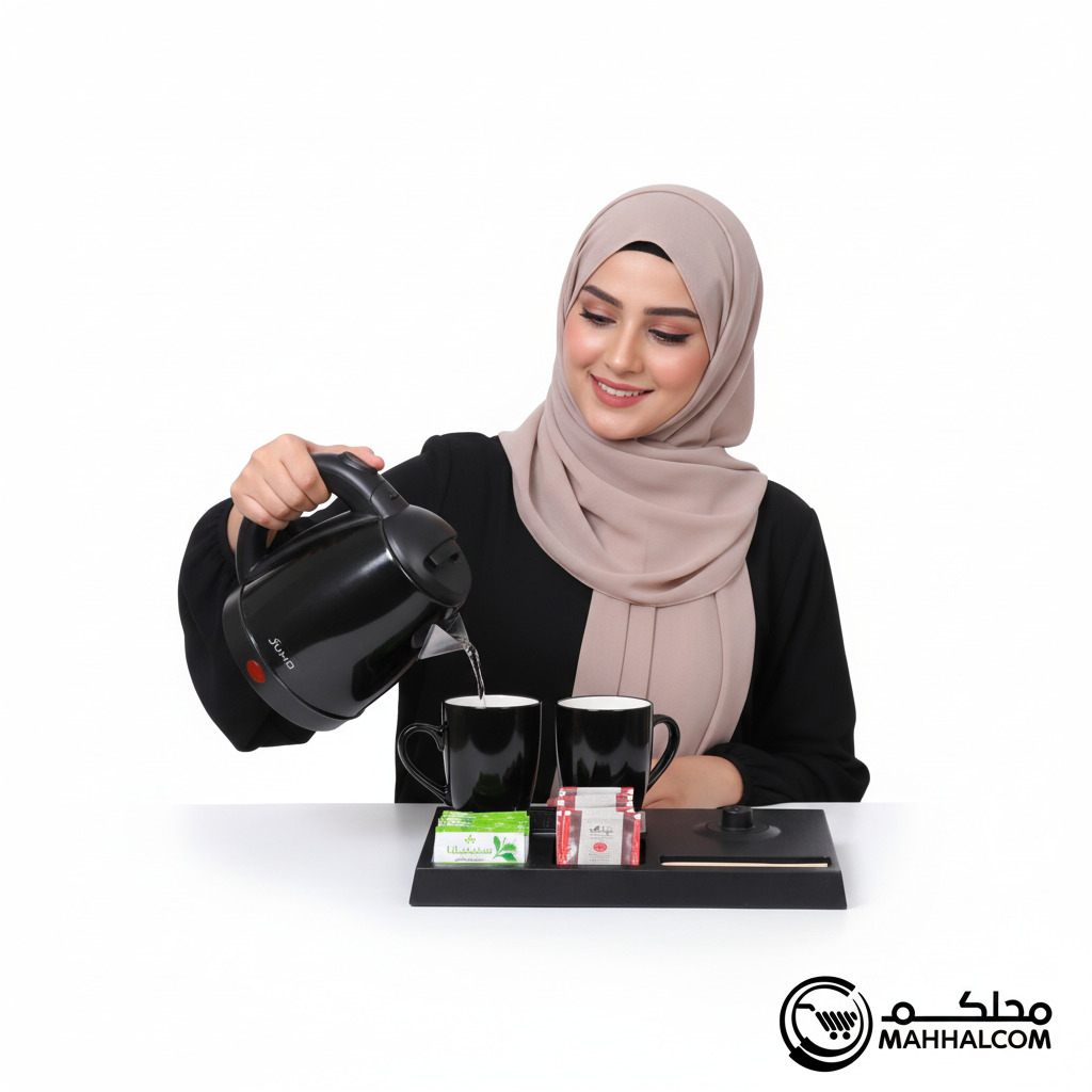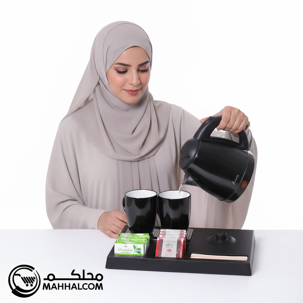 Sumo KT-930 1.2L hotel kettle set with 1350W power, double-wall design, auto shut-off, and boil-dry protection — ideal for hotels, offices, and guest rooms.