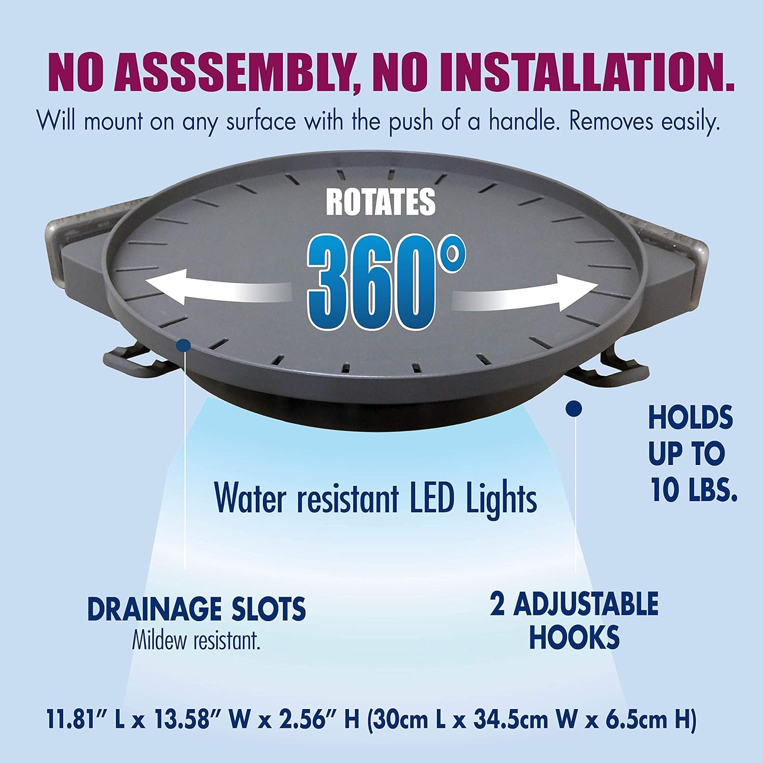 Instahang Rotating Shelf offers an innovative way to organize your home by utilizing unused storage space. This shelf fits in corners, and the tray on top spins a full 360°, giving you easy access to all your belongings. Instahang can be used virtually anywhere: place it in your bathroom, kitchen, bedroom, living room, or dorm room. In the bathroom, it works great as an extra shower shelf because it has slits that allow water to freely flow through. This helps prevent mold or mildew from building up when it’s used in your shower or bathtub. Use it as a holder for your shampoo, conditioner, and other bathroom accessories. This kit also includes 2 hooks to hang your loofah sponge or razor in the shower. The water-resistant LED lights are ideal for placing inside dark showers, kitchen cabinets, or refrigerators. For all other uses, Instahang comes with a removable insert cover. The cover creates a base for all your belongings, like medicine, vitamins, makeup, or laundry detergent. You can even use it as a kitchen cabinet organizer or rotating spice rack. It’s easy to install Instahang—no tools or assembly required. Simply place Instahang in any corner, and push the pressure handle to create an instant shelf. Instahang uses unique polymer pressure pads with patent-pending Gripology mini suction cups to firmly latch onto any wall surface. This allows it to securely adhere to tile, fiberglass, ceramic, drywall, and more. Thanks to its unique installation, Instahang doesn’t damage walls. Instahang is strong and durable enough to support 10-pounds, so you can put plenty of things atop it. Add Instahang to your home essentials and supplies today for instant efficient organization and storage.