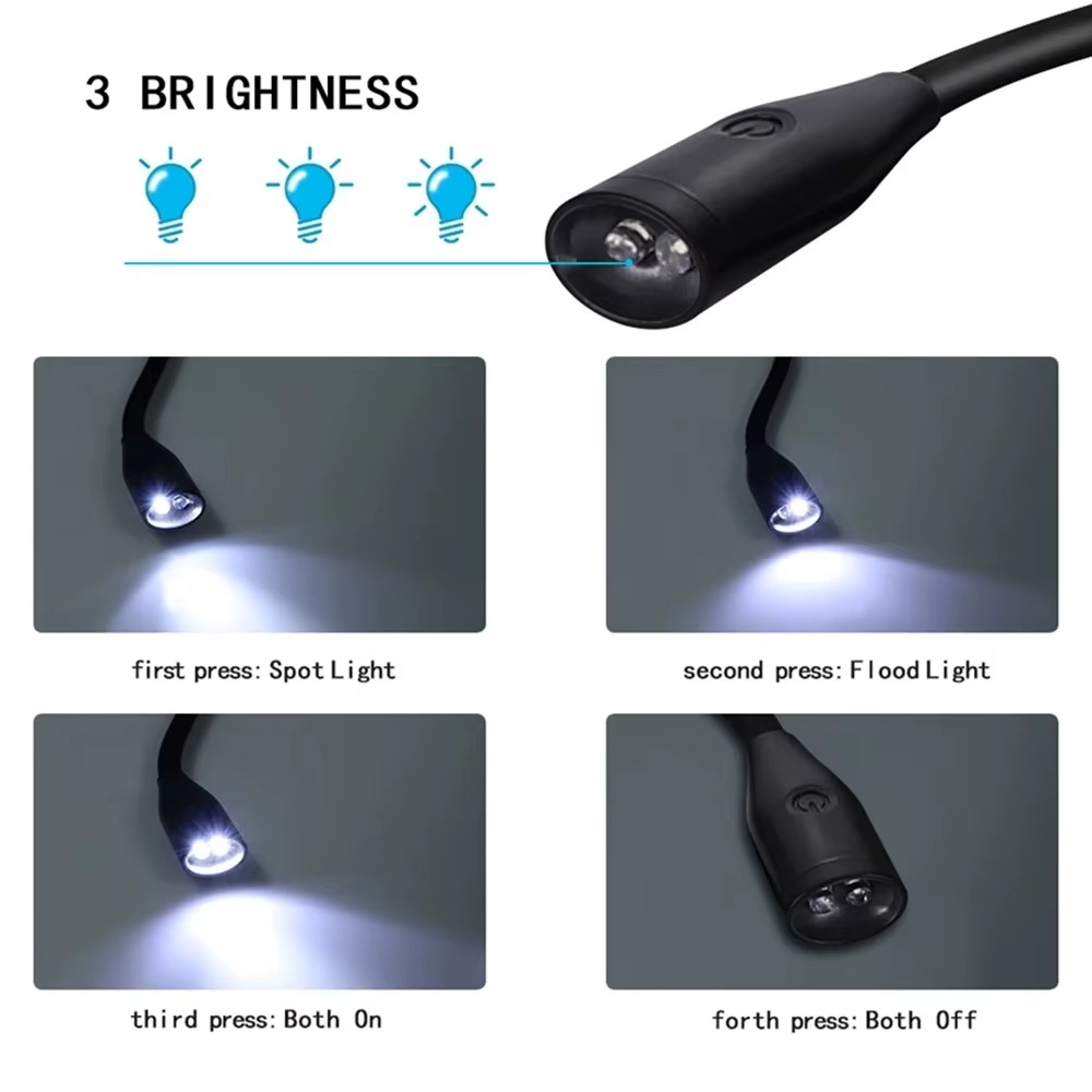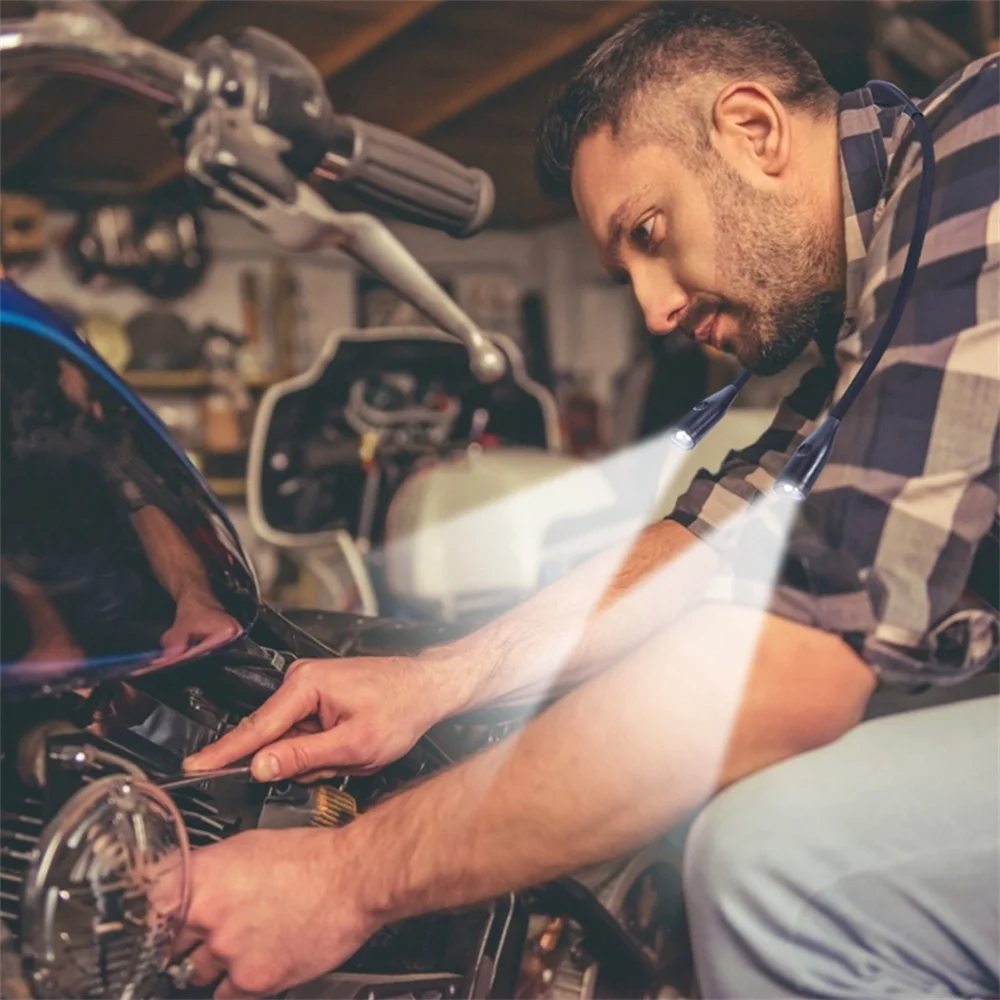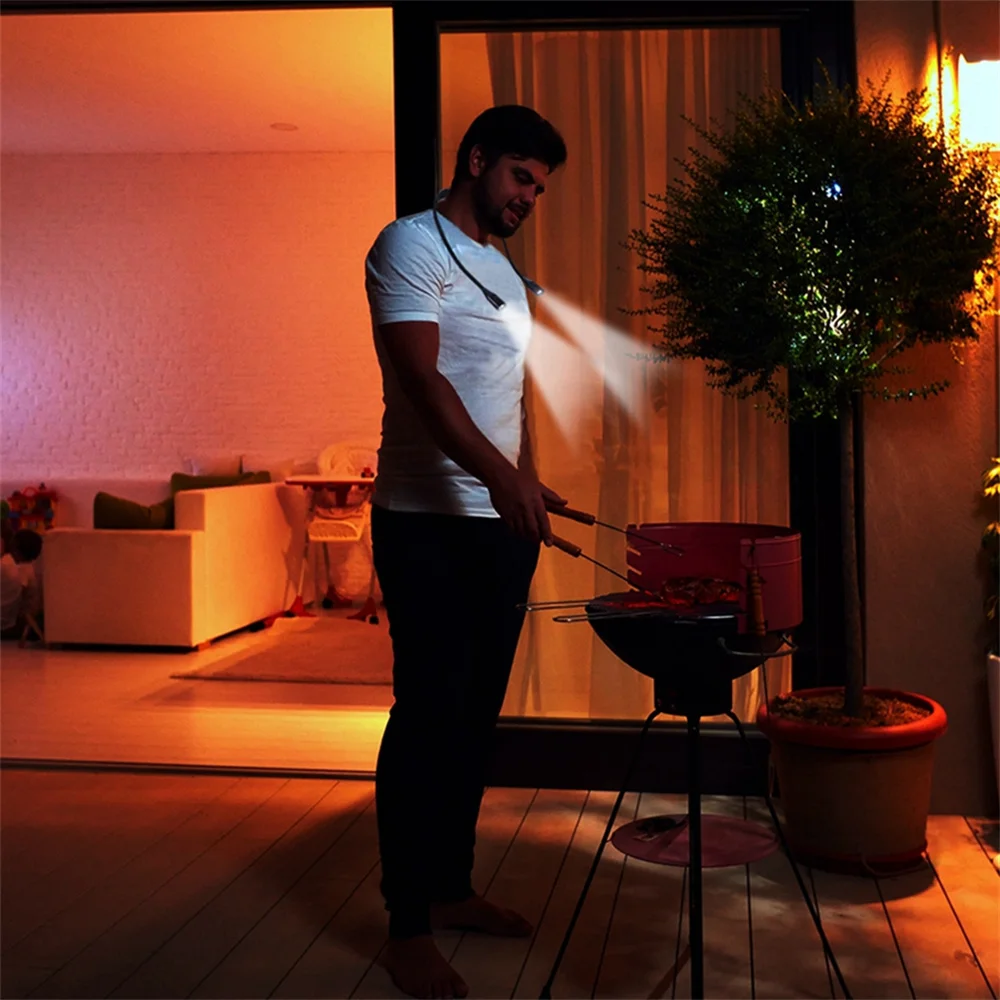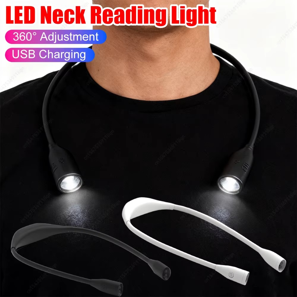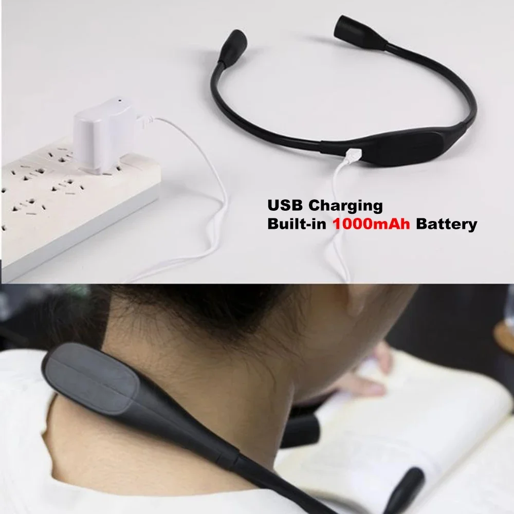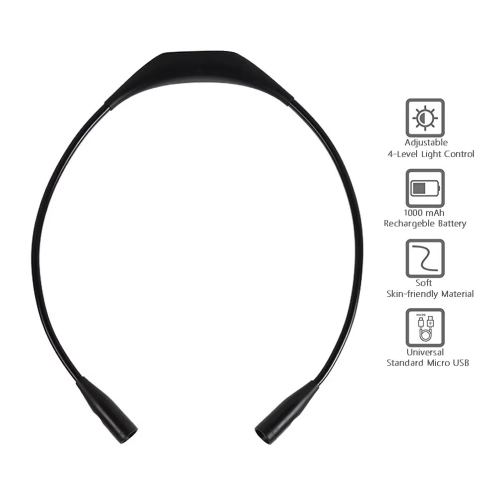 The Neck Reading Light is a hands-free, portable, and rechargeable LED lamp designed for book lovers, crafters, and night readers. Lightweight at only 3.6 oz, it rests comfortably around your neck, freeing your hands for reading, knitting, crocheting, or other tasks. Equipped with 2 LED bulbs and independent switches on each arm, it offers 9 brightness modes across 3 color temperatures (Warm, Natural, White). The flexible bendable arms let you adjust the light angle easily without disturbing others. Powered by a built-in 800 mAh rechargeable battery, it lasts up to 60 hours per charge, saving money and reducing waste compared to disposable batteries. Compact, lightweight, and travel-friendly, this light is ideal for reading in bed, outdoor walks, sewing, or crafting.
