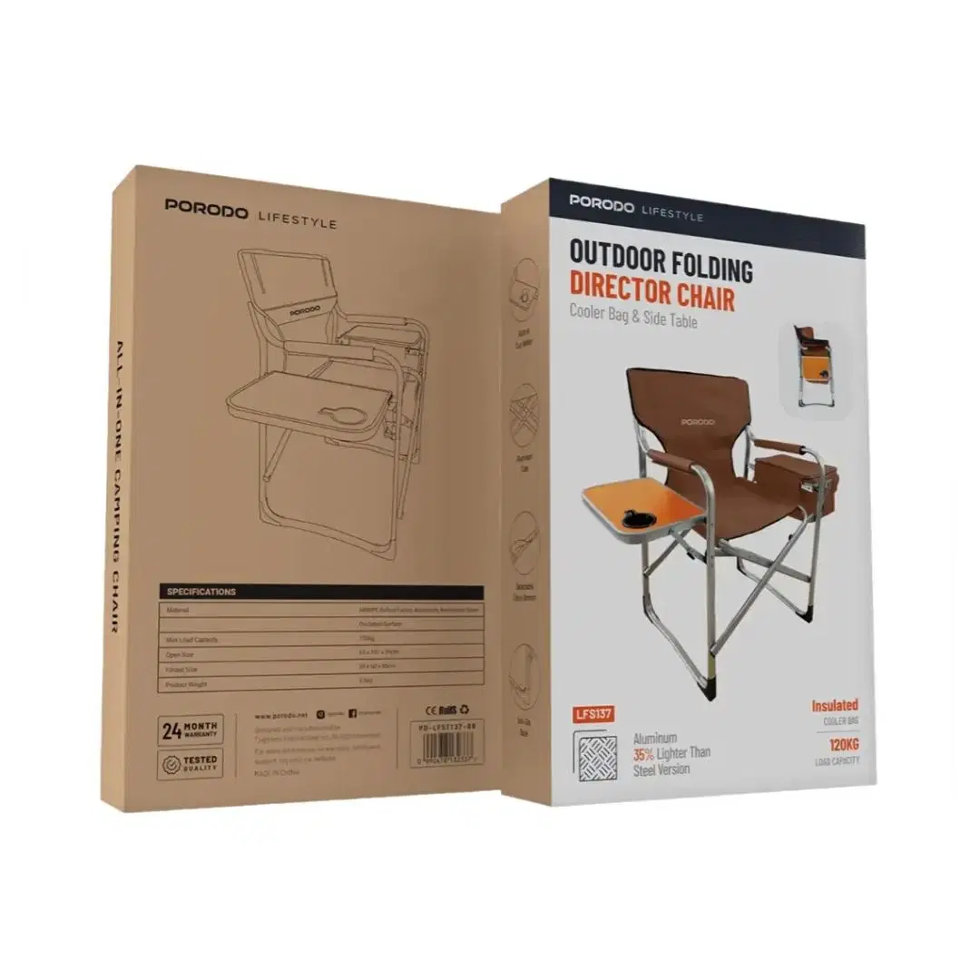Porodo outdoor folding director chair with insulated cooler bag, side table, cup holder, non-slip base, and lightweight aluminum frame for comfortable outdoor seating.