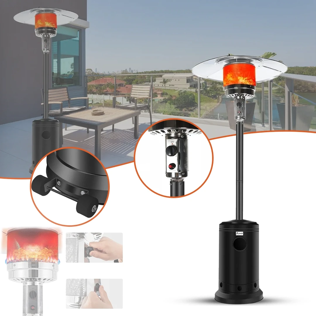 Equipped with a gas ignition switch, built-in lighter button, and a secure butane cylinder compartment, the heater offers reliable safety and controlled operation. Flexible wheels at the base allow for effortless mobility, making repositioning quick and easy.