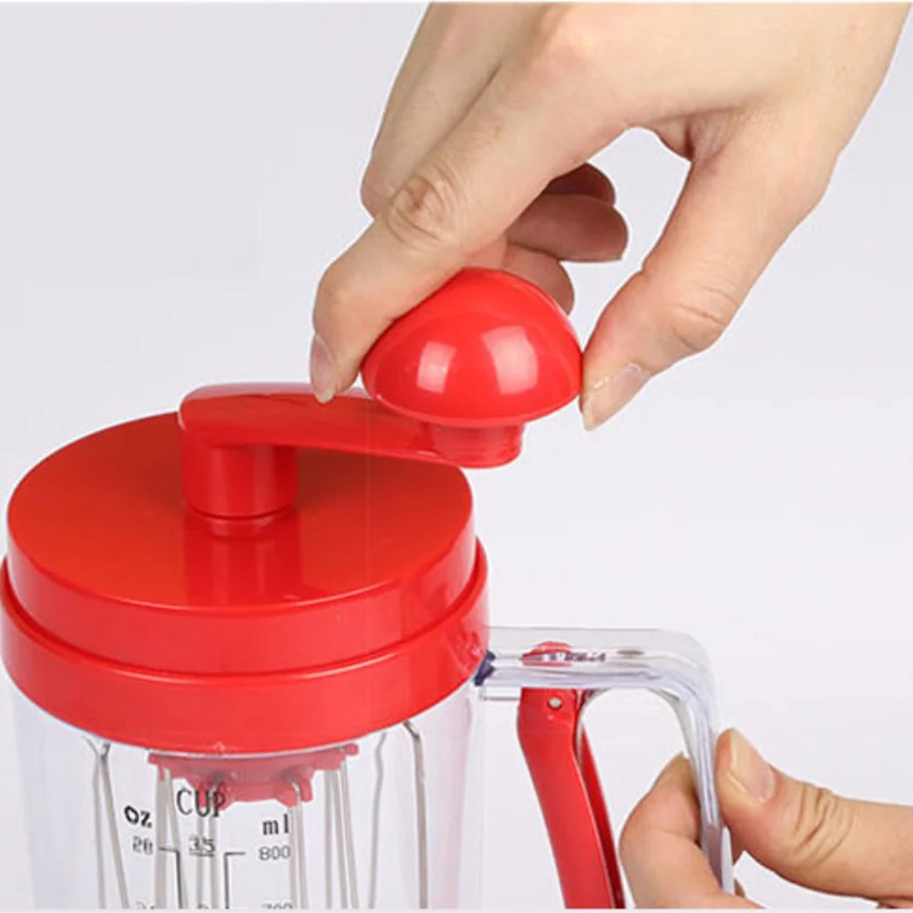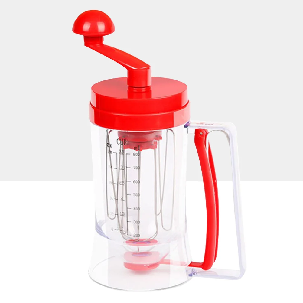 Manual pancake batter dispenser with built-in whisk for smooth, mess-free pouring — perfect for pancakes, cupcakes, muffins, and more.
