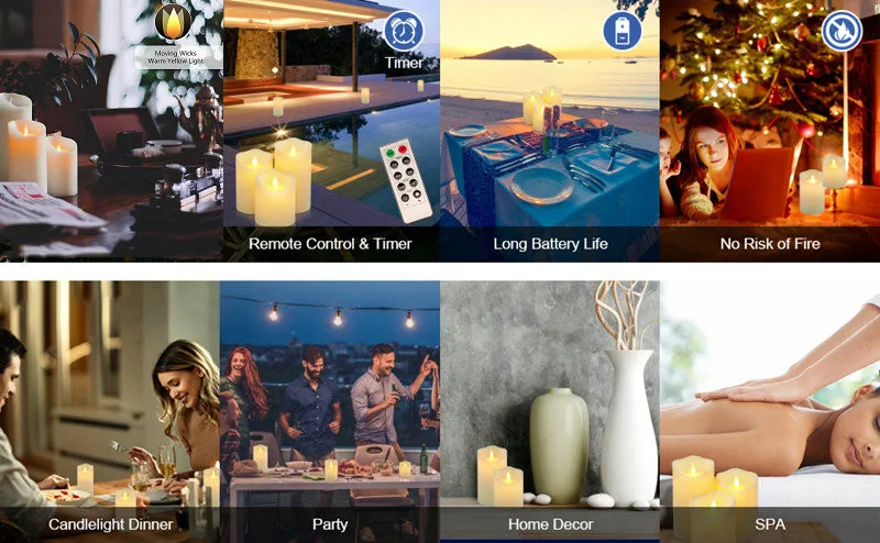 For added convenience, the upgraded USB rechargeable version offers dancing wicks and a moving flame effect that mimics real candles beautifully. Once charged, the candles can be controlled via the 10-key remote to adjust brightness, flicker mode, or set automatic timers (2H / 4H / 6H / 8H).