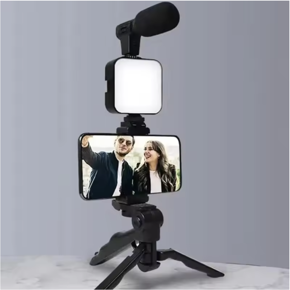 microphone, LED fill light, tripod, phone holder, bluetooth remote control.