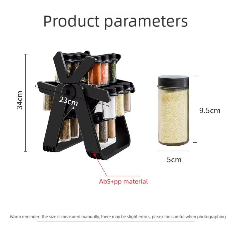 Equipped with 18 high-quality 100ml glass jars, it provides plenty of room to neatly store your favorite spices, herbs, and seasonings. The smooth 360° rotating design makes it easy to select the spice you need with just a quick spin, while the transparent jars allow for instant identification of contents.