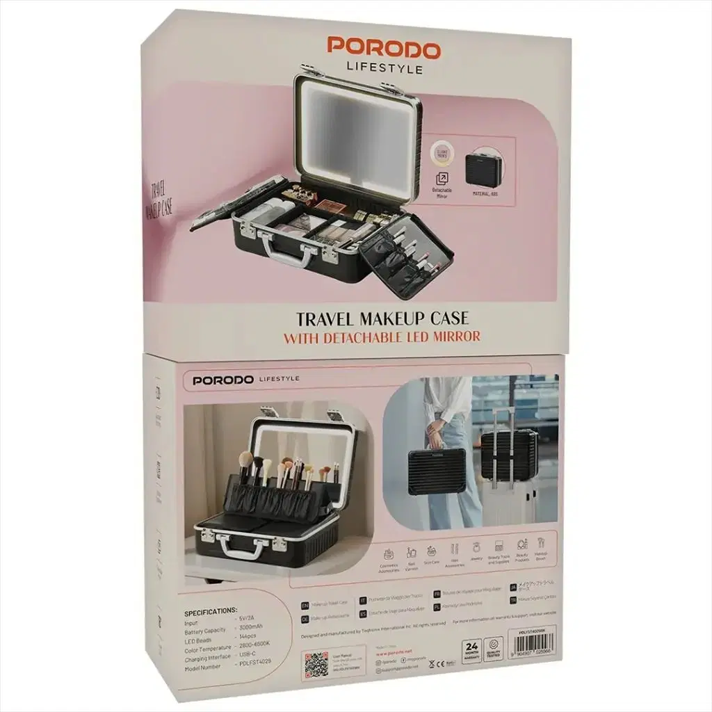 Porodo travel makeup case with detachable LED mirror (PDLFST4029BK), featuring adjustable brightness, 2800–6500K color temperature, 3000mAh battery, and organized compartments for professional makeup anywhere.