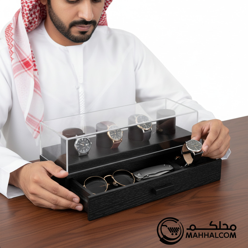 Modern Watch Box Organizer for Men – Elegant wooden display case with clear acrylic lid and valet tray. Features dust-proof protection, smooth drawer, and metal-free holders for all watch sizes — the perfect gift for the modern gentleman.