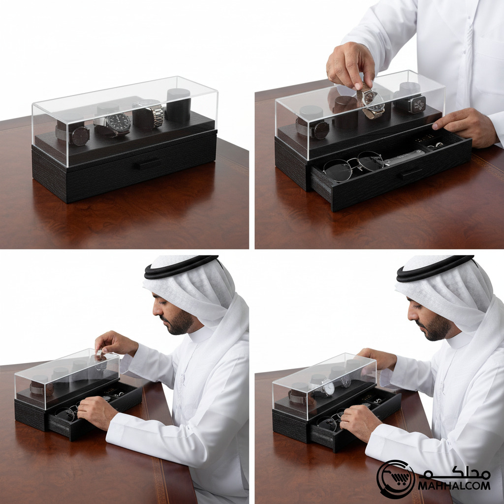 Crafted with a sleek black finish and a clear acrylic display cover, it allows you to showcase your favorite watches while maintaining a refined, masculine look that fits perfectly on your dresser, nightstand, or office desk.