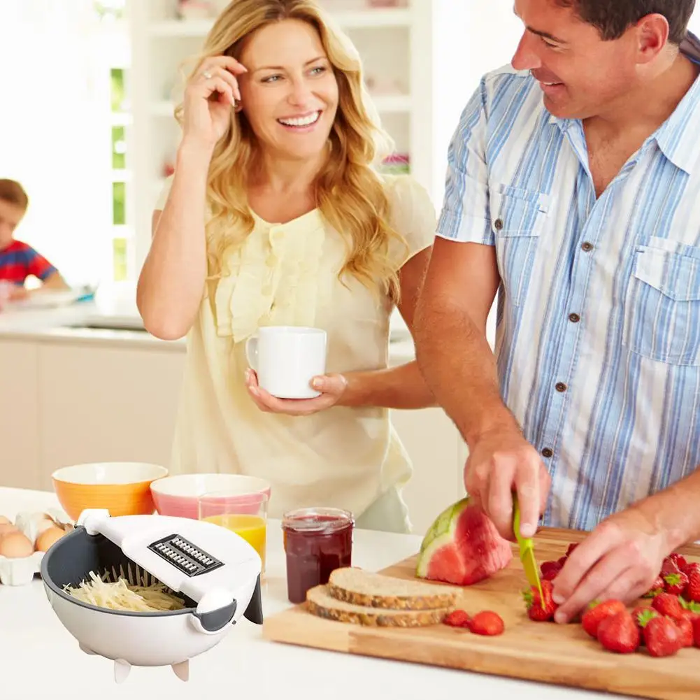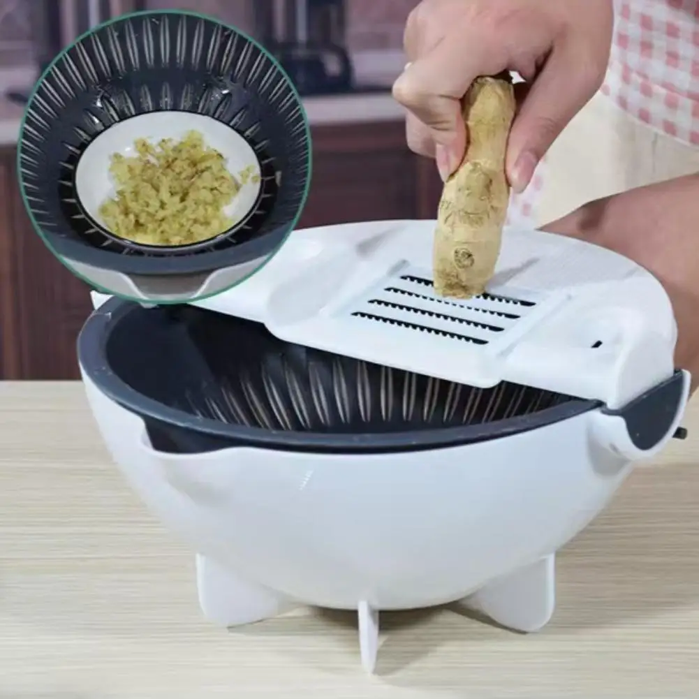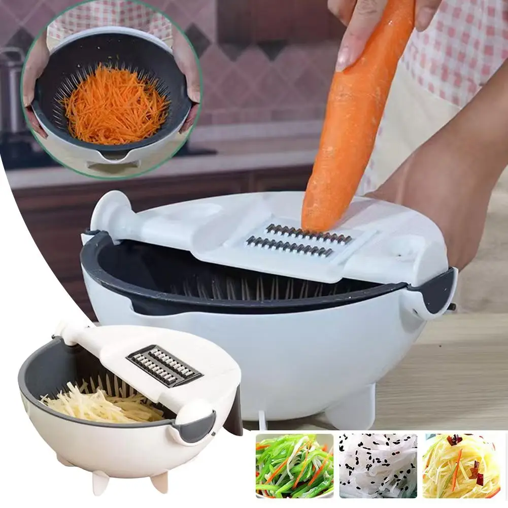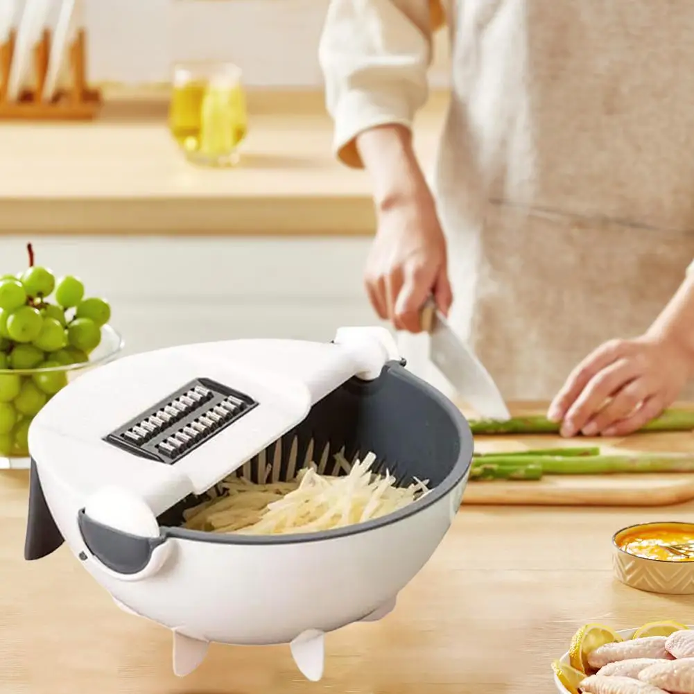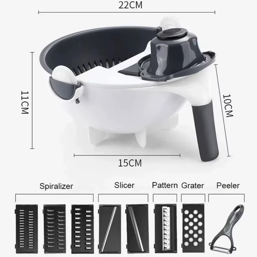 1. 9-in-1 multifunctional vegetable forcutter, including 7 different blades, a drain basket, and a non-slip mat, meets various needs such as slicing, shredding, and dicing, making it easy to handle fruits and vegetables.