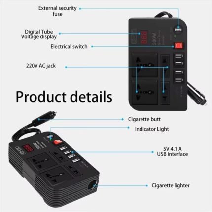 car inverter with 4 AC outlets & 4 USB ports – converts DC 12V to AC 220V with full safety protections and fast cooling design. 300W