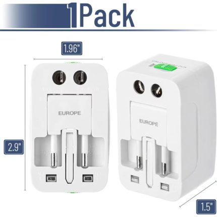 Universal USB travel adapter with surge protection – compact, lightweight, and compatible with USA, EU, UK, AU, and India outlets. Perfect for international travel.