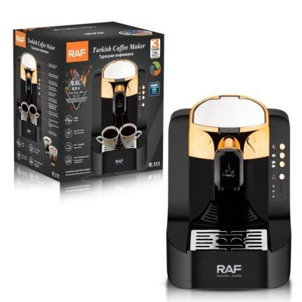 RAF R.111 700W Turkish coffee maker with 0.8L tank, self-cleaning system, safety protection, and drainage tray for authentic 2-cup brewing.
