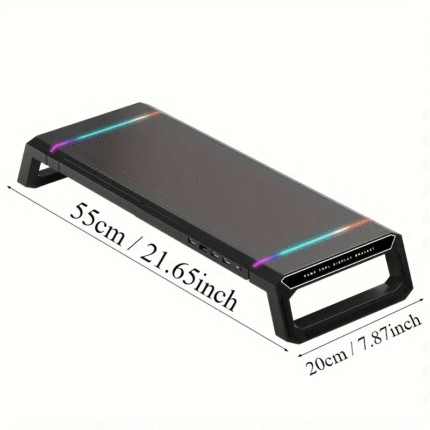Elevate your workspace with the Ergonomic Monitor Stand featuring RGB lighting and 4 USB ports. Adjustable height up to 80mm enhances comfort, while a storage compartment keeps your desk tidy. Its foldable design suits PCs, laptops, desktops, and mobile devices. Nonslip features ensure stability, making it an essential accessory for a productive setup.