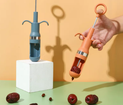 Cherry core remover tool, ABS + stainless steel, handheld push design, easy to use & clean, safe for cherries, jujubes, dates, olives, and more.