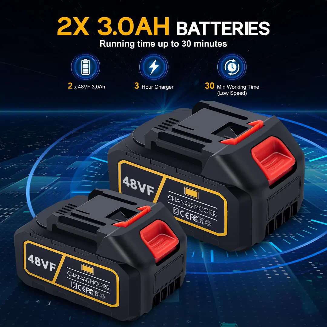 🔋🔄 Equipped with two 21V 2000mAh lithium-ion batteries, including an extra backup battery, it ensures longer working time and uninterrupted performance. Intelligent protection circuitry safeguards against overheating, overload, overcharging, overvoltage, and full discharge. A full charge takes approximately 2–4.5 hours, providing around 30 minutes of continuous operation per battery.