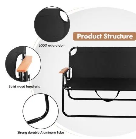 Black foldable camping bench chair with alloy steel frame, Oxford polyester fabric, ergonomic support, and portable design for indoor and outdoor use.